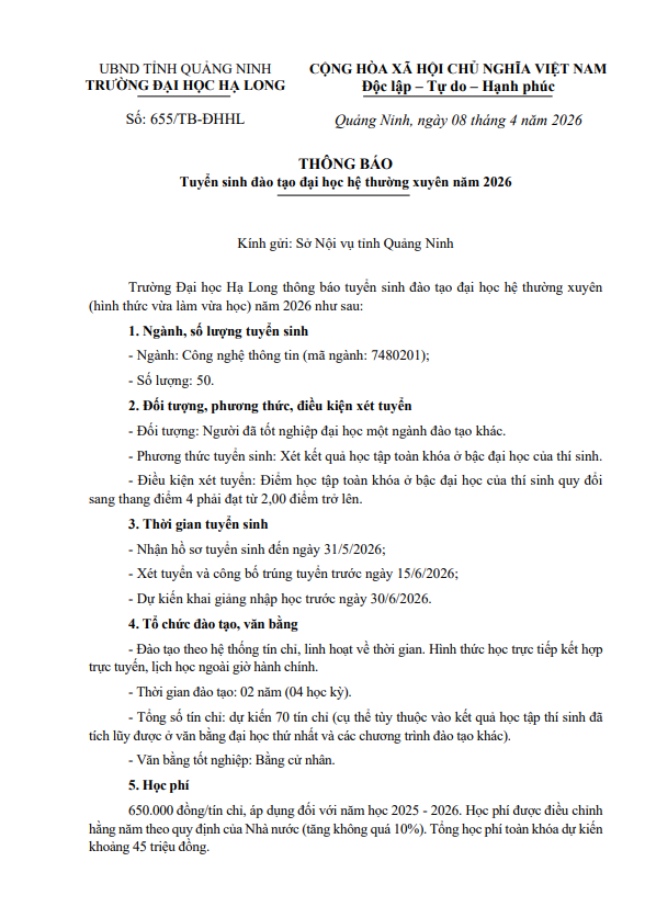 Thông báo tuyển sinh đào tạo đại học hệ thường xuyên năm 2026