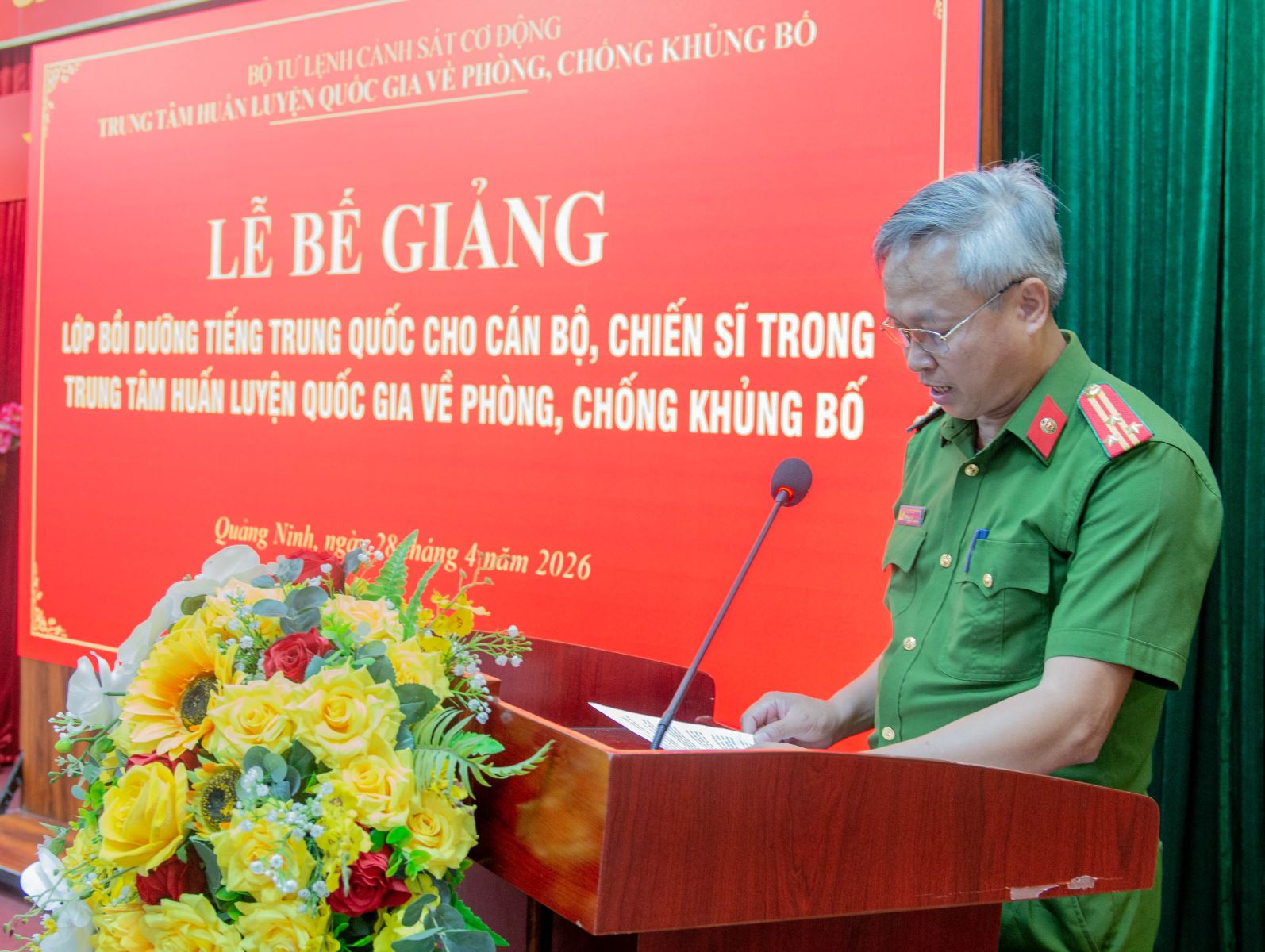 Cũng tại buổi Lễ, Phó Giám đốc Trung tâm Huấn luyện quốc gia về phòng chống khủng bố Nguyễn Đức Huỳnh gửi lời cảm ơn sâu sắc tới Trường Đại học Hạ Long nói chung, và Trung tâm Ngoại ngữ – Tin học nói riêng khi đã tổ chức thành công khóa học bồi dưỡng tiếng Trung Quốc cho hơn 70 cán bộ, chiến sỹ. Điểm lại quá trình học tập và các kết quả đạt được của khóa học bồi dưỡng trong suốt thời gian vừa qua, Thượng tá Nguyễn Đức Huỳnh đánh giá cao những nỗ lực và các kết quả đạt được của các đồng chí học viên khi có thể nghe, nói, đọc, viết và tiếp thu các kiến thức cơ bản về tiếng Trung Quốc bất chấp những khó khăn đặc thù về mặt thời gian của các cán bộ chiến sỹ. Nhấn mạnh vai trò ngày càng cao của tiếng Trung trong bối cảnh toàn cầu hóa và hợp tác quốc tế ngày càng sâu rộng hiện nay, đồng chí Phó Giám đốc Trung tâm kỳ vọng các chiến sỹ sẽ tiếp tục trau dồi, phát huy tốt vốn tiếng Trung đã có sau khóa học cũng như trình độ chuyên môn trong môi trường quốc tế, bản lĩnh chính trị nhằm thực hiện tốt Nghị quyết số 12 của Bộ Chính trị về đẩy mạnh lực lượng Công an nhân dân thực sự trong sạch, vững mạnh, chính quy tinh nhuệ hiện đại, đáp ứng được yêu cầu nhiệm vụ trong tình hình mới.