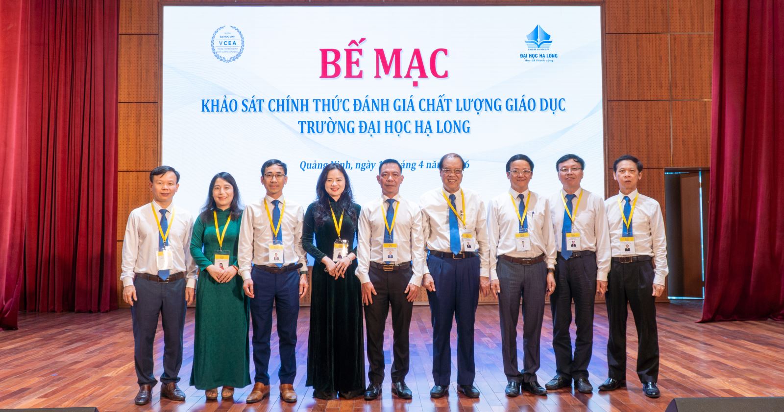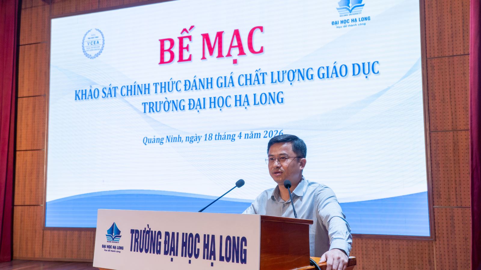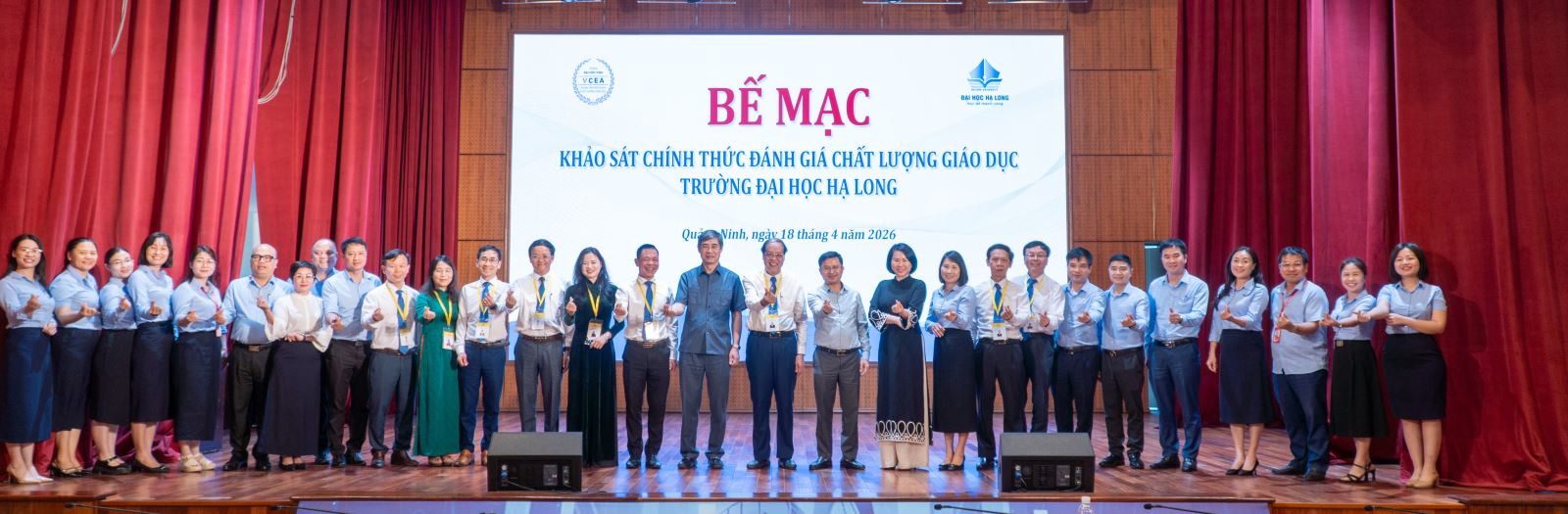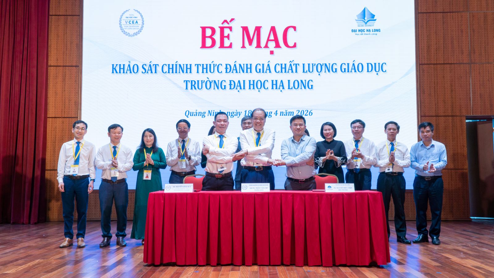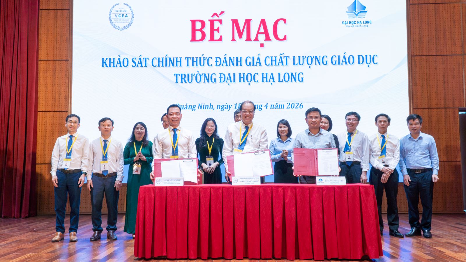 Sau khoảng thời gian làm việc khẩn trương, nghiêm túc, khách quan và minh bạch, sáng ngày 18/4/2026, Trường Đại học Hạ Long phối hợp cùng Trung tâm Kiểm định chất lượng giáo dục Trường Đại học Vinh đã ký kết biên bản kết thúc đợt khảo sát chính thức đánh giá chất lượng giáo dục tại Hội trường nhà T, Trường Đại học Hạ Long.