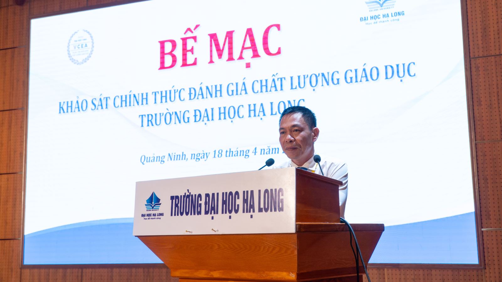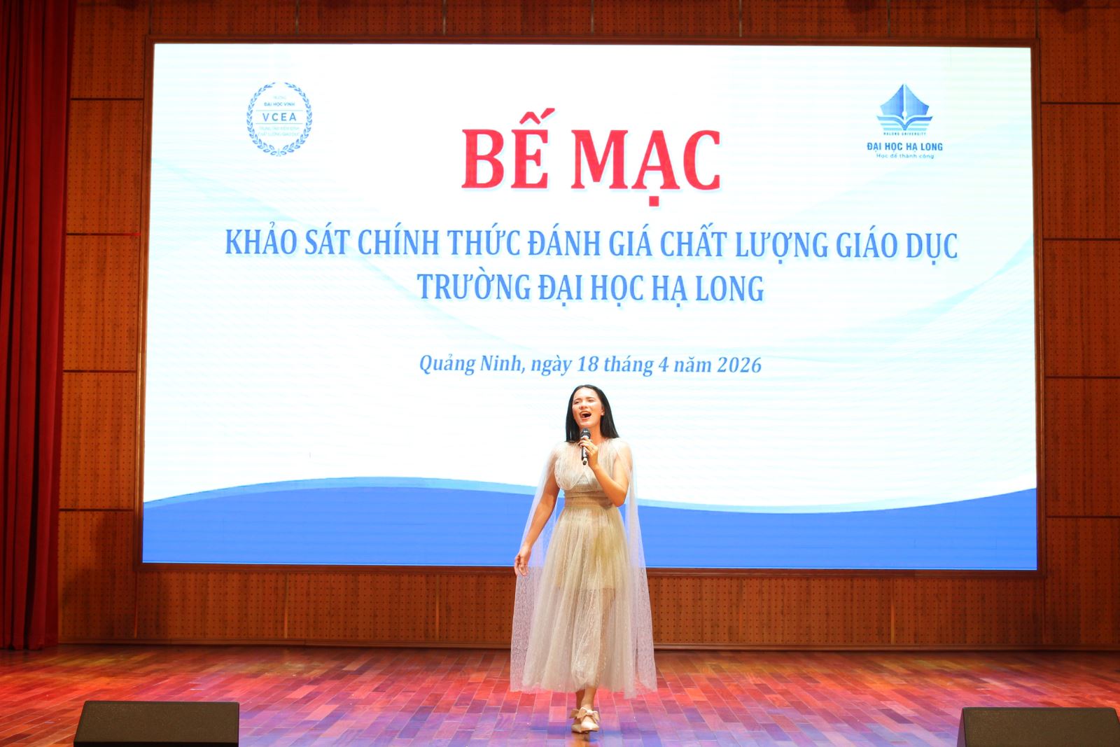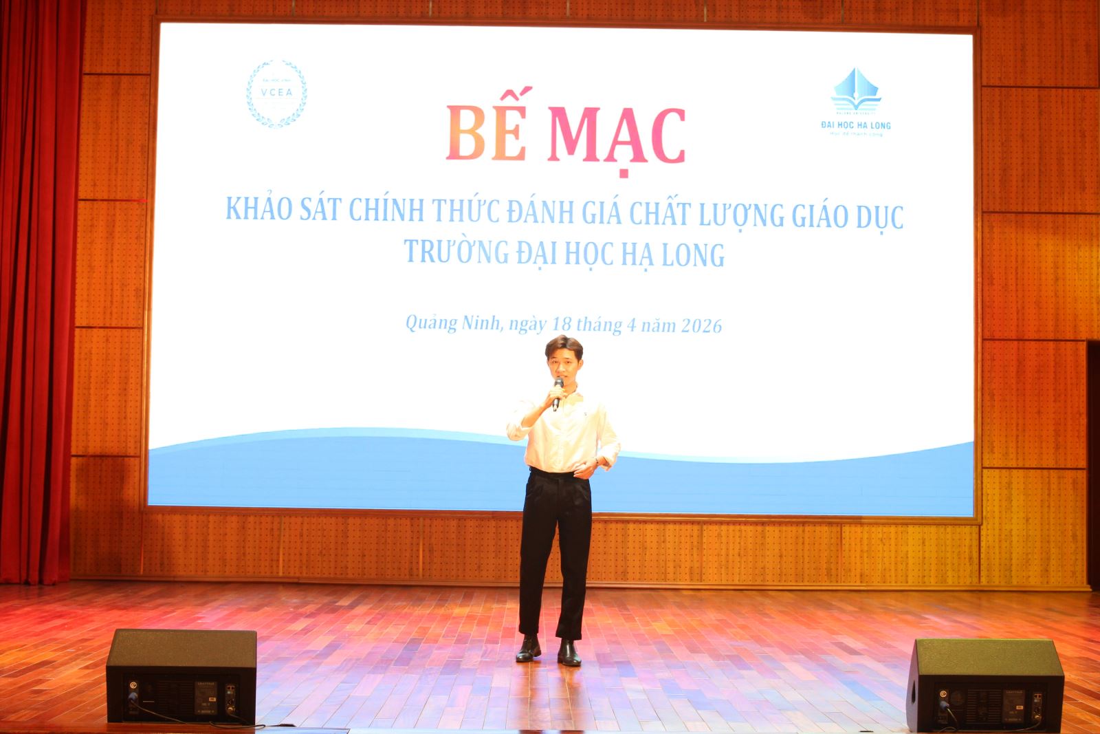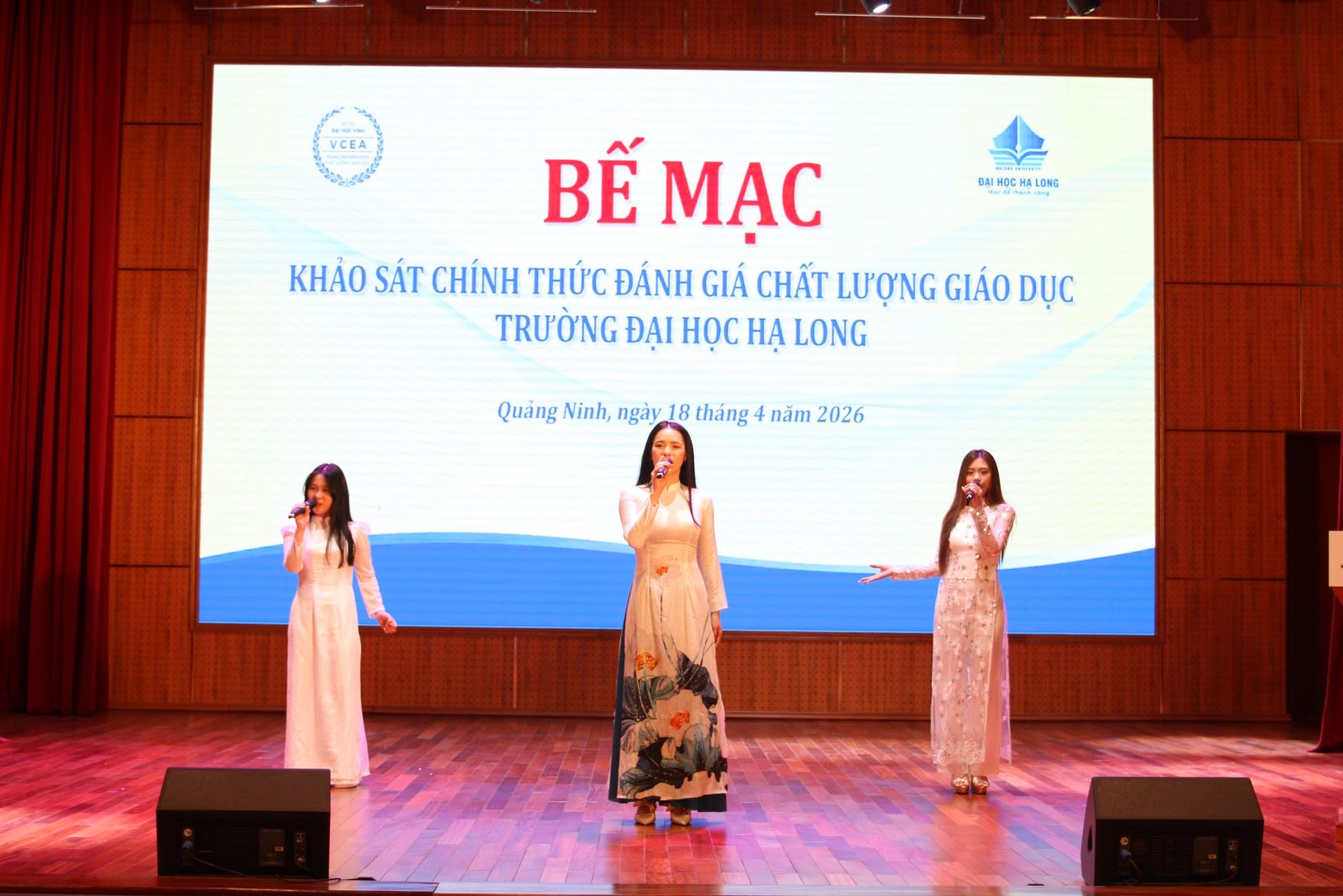 Sau khoảng thời gian làm việc khẩn trương, nghiêm túc, khách quan và minh bạch, sáng ngày 18/4/2026, Trường Đại học Hạ Long phối hợp cùng Trung tâm Kiểm định chất lượng giáo dục Trường Đại học Vinh đã ký kết biên bản kết thúc đợt khảo sát chính thức đánh giá chất lượng giáo dục tại Hội trường nhà T, Trường Đại học Hạ Long.