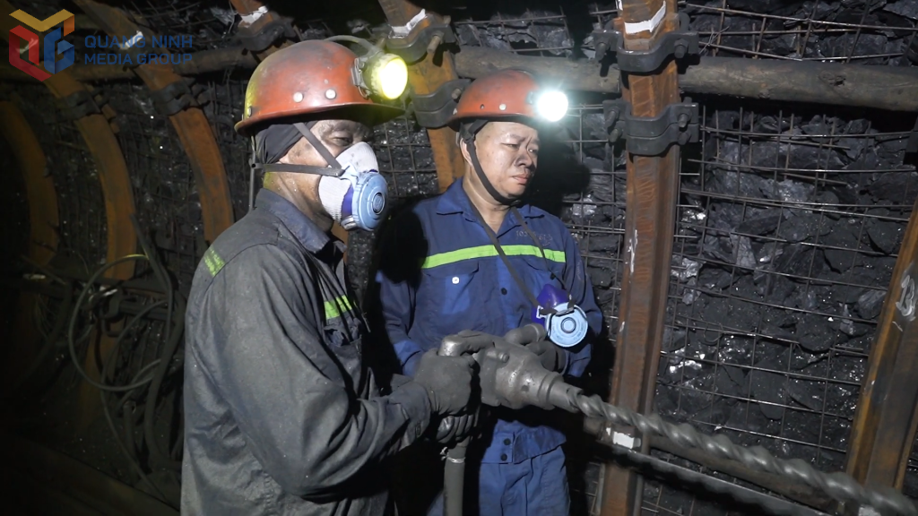 Công nhân Công ty Than Khe Chàm vận hành thiết bị khoan trong ca làm việc dưới hầm lò.