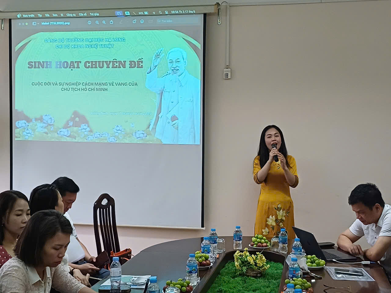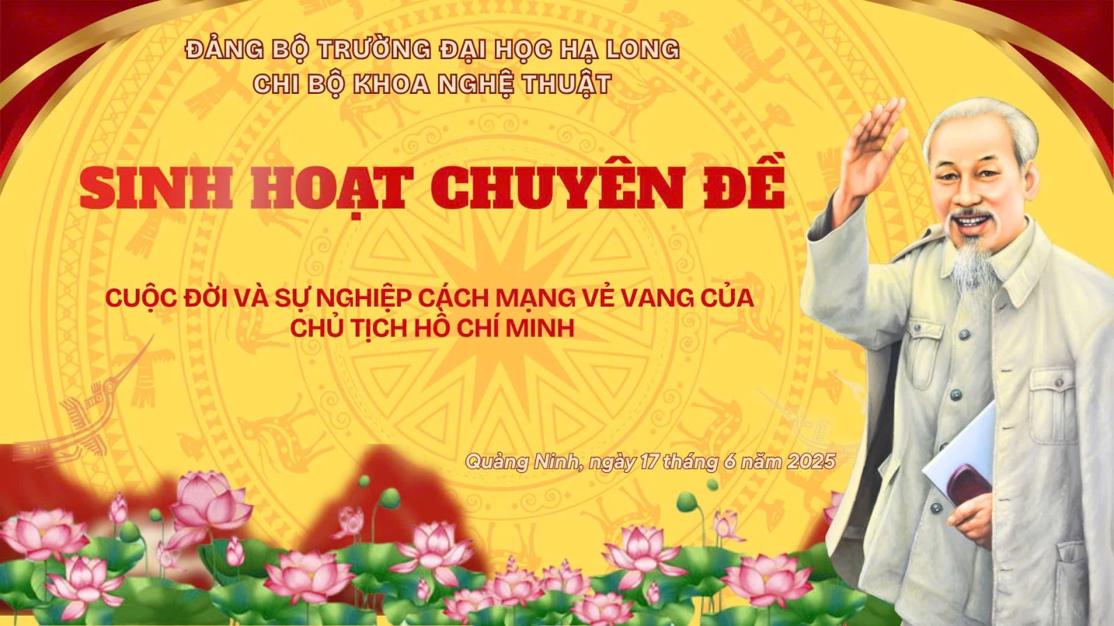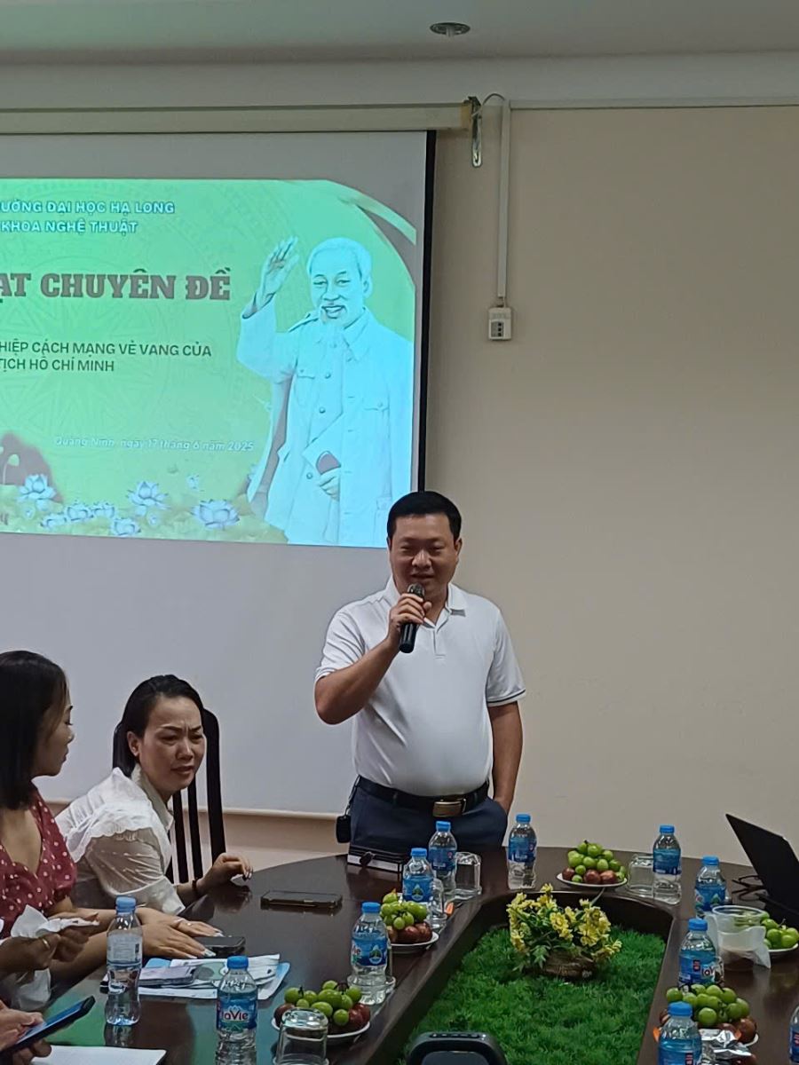 Sáng ngày 17/6/2025, tại phòng họp cơ sở 2 – Trường Đại học Hạ Long, Chi bộ Khoa Nghệ thuật đã trang trọng tổ chức buổi sinh hoạt chuyên đề quý II/2025 với chủ đề: “Cuộc đời và sự nghiệp cách mạng vẻ vang của Chủ tịch Hồ Chí Minh”. Chương trình được tổ chức theo hình thức kết hợp tọa đàm và sân khấu hóa – một cách làm sáng tạo, gắn với thế mạnh chuyên môn của Khoa Nghệ thuật.