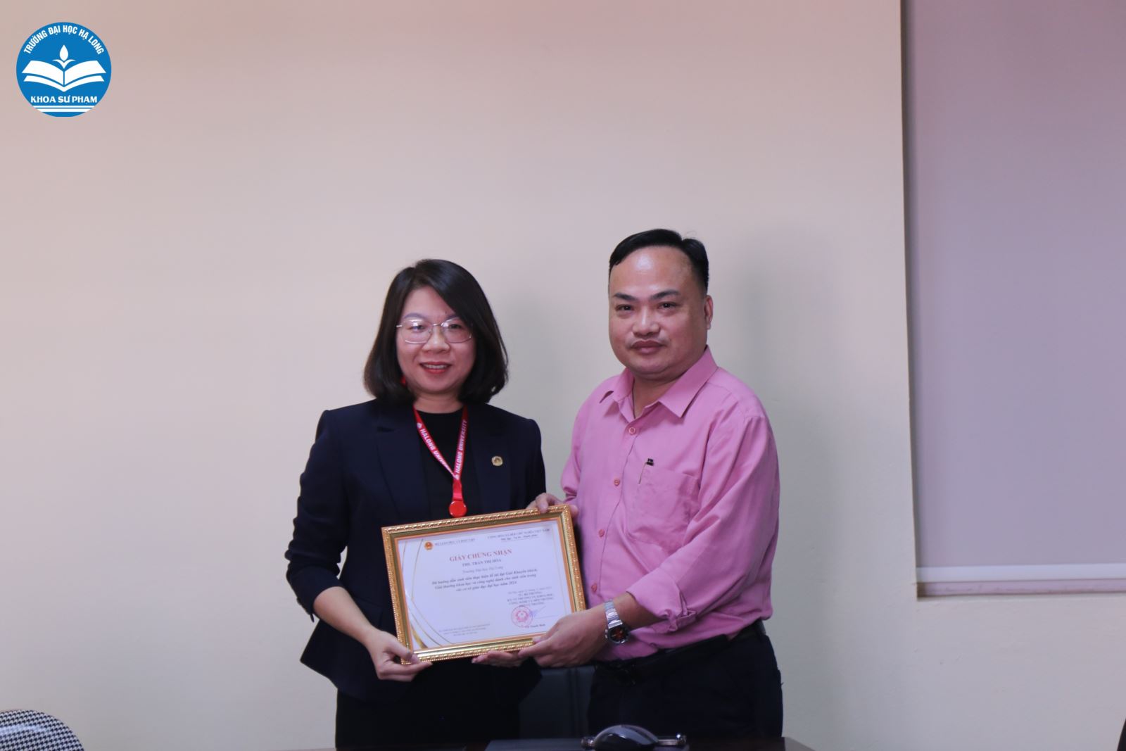 Cũng tại buổi sinh hoạt, TS. Vũ Vương Trưởng đã trao tặng giấy chứng nhận và giấy khen cho giảng viên và sinh viên đạt thành tích trong nghiên cứu khoa học và công nghệ. Cụ thể, trao Giấy chứng nhận của Bộ Giáo dục và Đào tạo về Đã hướng dẫn sinh viên thực hiện đề tài đạt Giải Khuyến khích, Giải thưởng khoa học và công nghệ dành cho sinh viên trong các cơ sở giáo dục đại học năm 2024 cho Th.S Trần Thị Hoà; trao Giấy khen của Quỹ Hỗ trợ sáng tạo kỹ thuật Việt Nam (VIFOTEC) cho sinh viên Đào Hà Trang (lớp K7.SMN1 - Khoa Sư phạm) vì đã đạt giải Khuyến Khích - Giải thưởng Khoa học và Công nghệ dành cho sinh viên trong cơ sở giáo dục đại học năm 2024.