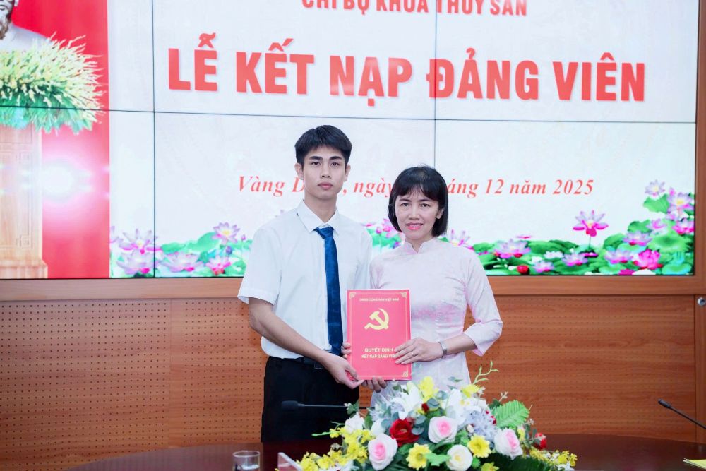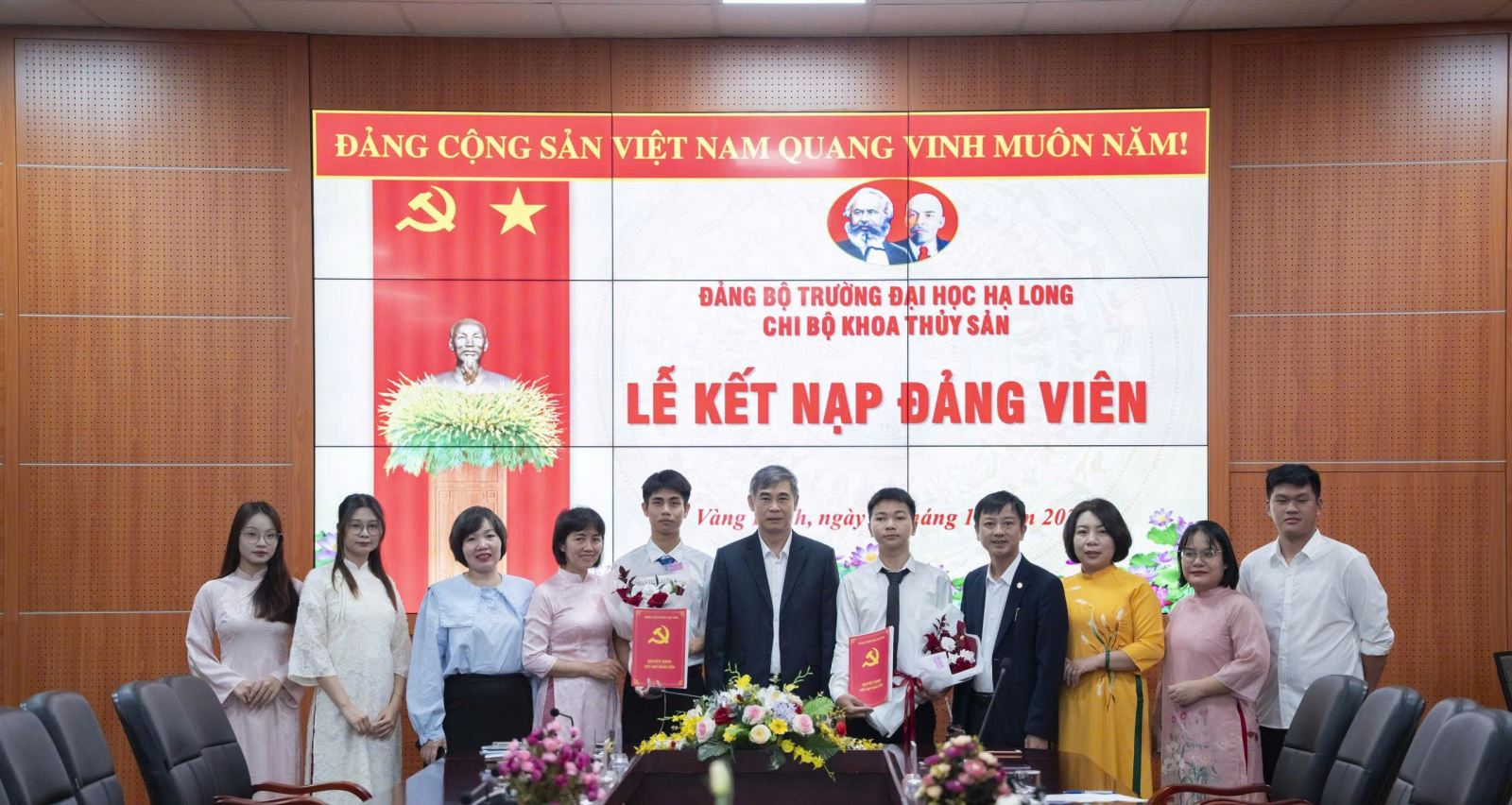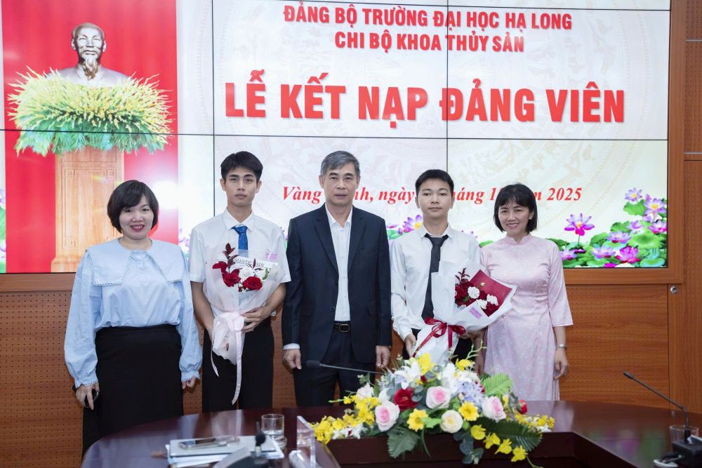 Thực hiện Quyết định số 307-QĐ/ĐU và 308-QĐ/ĐU ngày 25/11/2025 của Đảng ủy Ủy ban nhân dân tỉnh, và được sự đồng ý của Đảng ủy Trường Đại học Hạ Long, sáng ngày 12/12/2025, tại phòng Hội thảo – Nhà Hiệu bộ Trường Đại học Hạ Long, Chi bộ Khoa Thủy sản đã long trọng tổ chức Lễ kết nạp Đảng viên cho hai quần chúng ưu tú Triệu Kim Sơn và Lê Quốc Khánh, sinh viên lớp NTTS K8, vào Đảng Cộng sản Việt Nam.