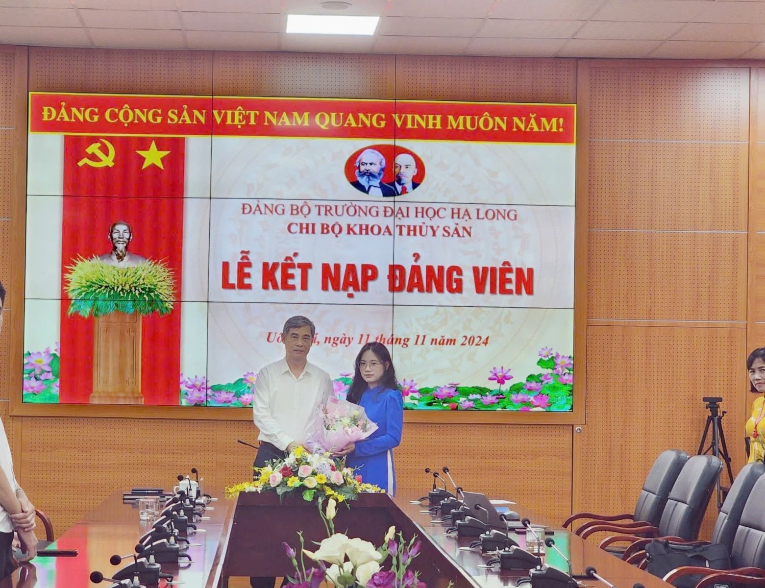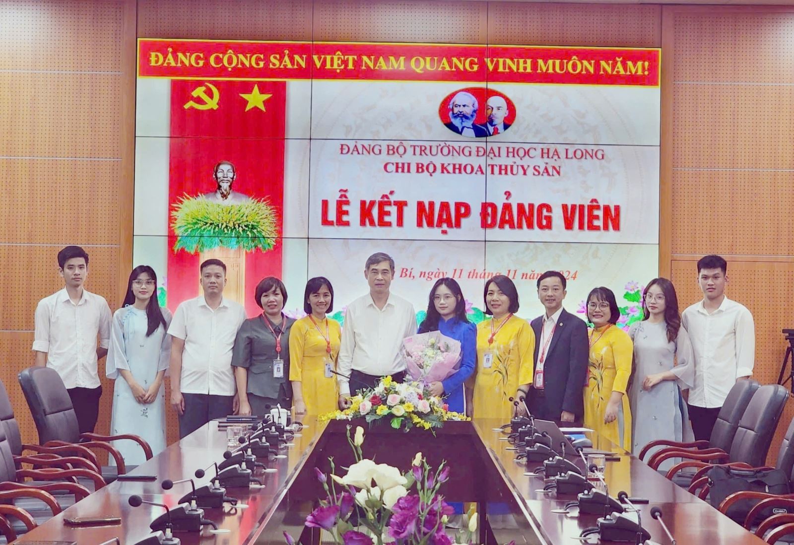 Thực hiện Quyết định Kết nạp đảng viên số 917-QĐ/ĐUK ngày 30/10/2024 của Đảng ủy khối các cơ quan tỉnh, được sự đồng ý của Đảng uỷ trường Đại học Hạ Long, chiều ngày 11/11/2024 tại phòng Hội Thảo tầng 7 nhà Hiệu Bộ, chi bộ Khoa Thủy sản đã long trọng tổ chức Lễ kết nạp đảng viên mới cho quần chúng ưu tú Lê Thị Thanh Hương.