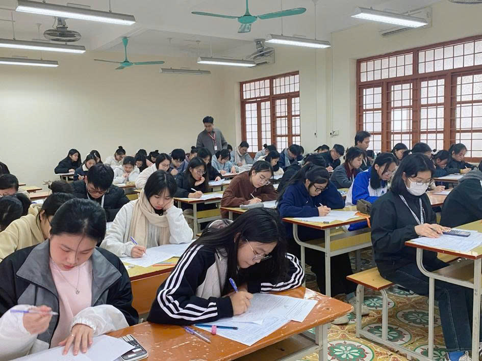 Sinh viên tập trung làm bài tại phần thi Giải Toán Tiểu học và Olympic toán học sinh viên