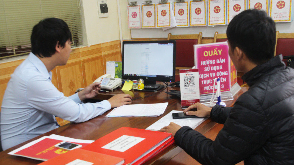 Cán bộ Trung tâm Hành chính công huyện Tiên Yên hướng dẫn người dân thực hiện nộp TTHC trên môi trường mạng.