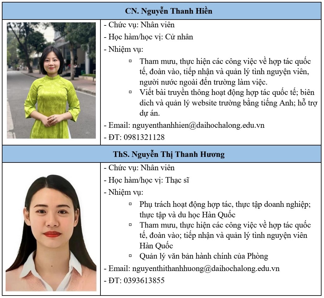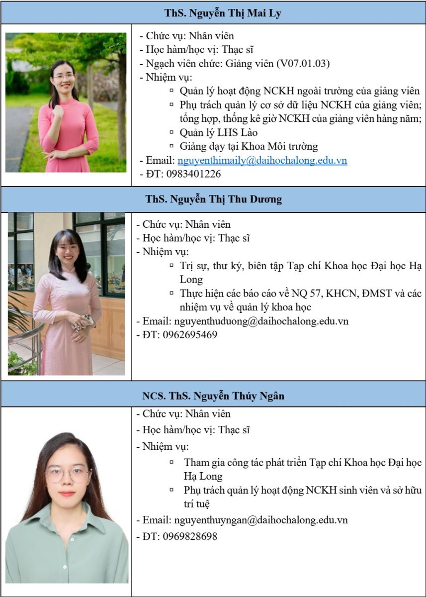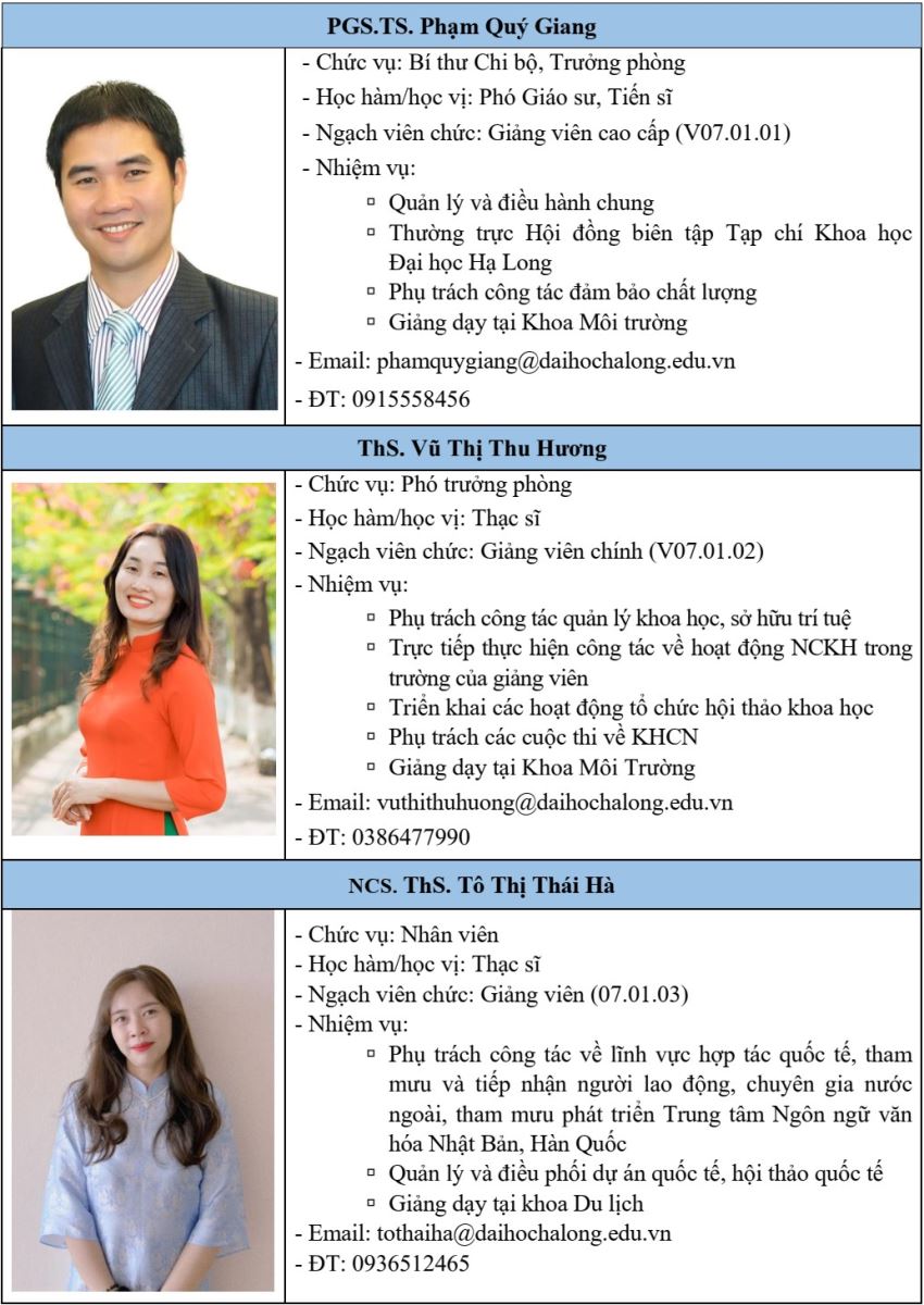 Đội ngũ cán bộ Phòng Hợp tác quốc tế và Quản lý khoa học có tổng số 08 người. Trong đó: