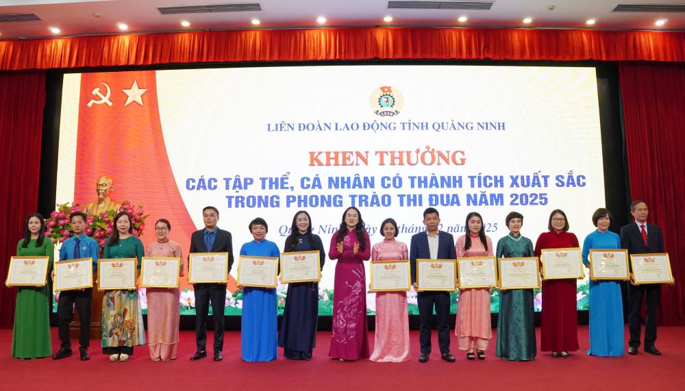Đồng chí Nguyễn Thị Ngọc Lan - Chủ tịch Công đoàn Trường (thứ 7 từ trái qua) nhận Bằng khen của Liên đoàn Lao động tỉnh Quảng Ninh vì đã có thành tích xuất sắc trong phong trào thi đua Lao động giỏi và xây dựng tổ chức Công đoàn vững mạnh năm 2025