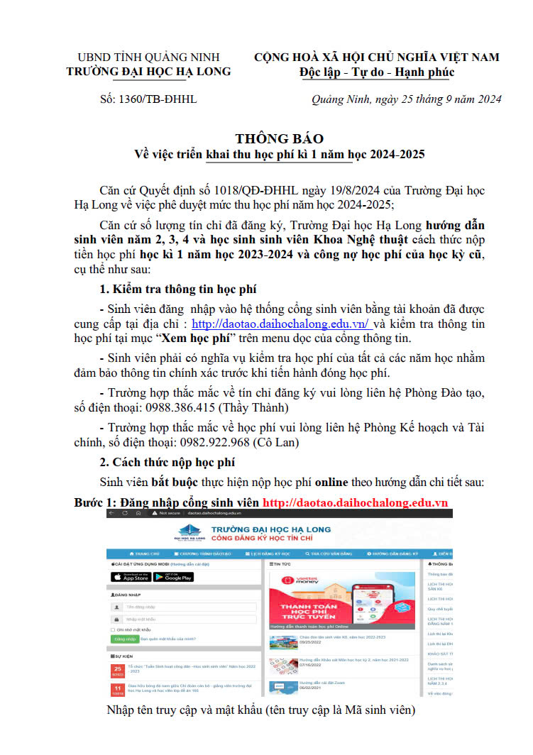 Thông báo về việc triển khai thu học phí kì 1 năm học 2024 - 2025