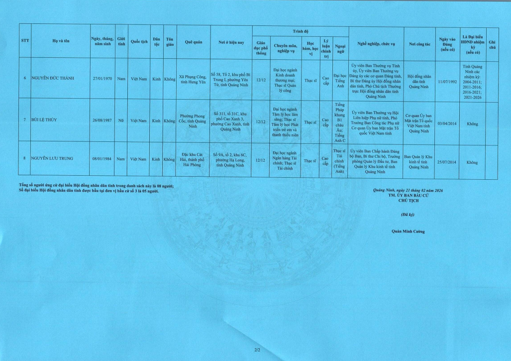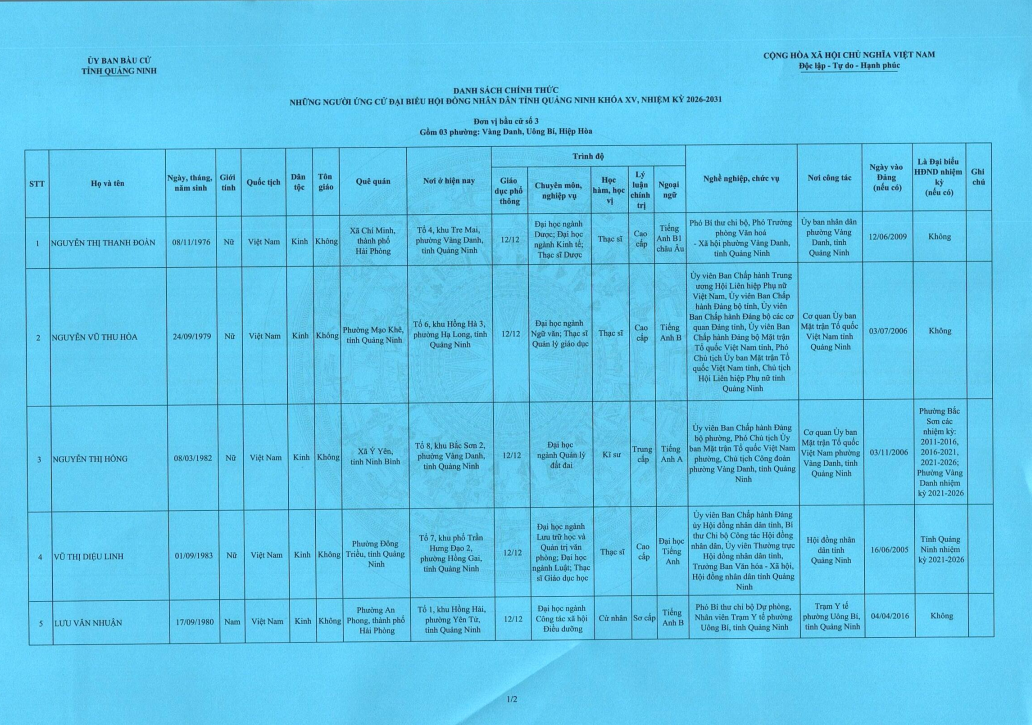 Danh sách chính thức những người ứng cử Đại biểu Hội đồng Nhân dân tỉnh Quảng Ninh khóa XV, nhiệm kỳ 2026 - 2031