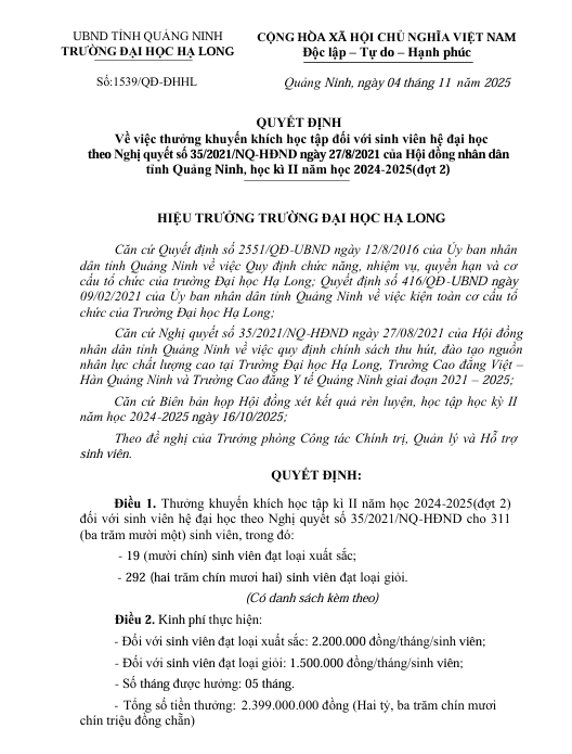 Danh sách sinh viên được thưởng khuyến khích học tập kỳ II năm học 2024-2025