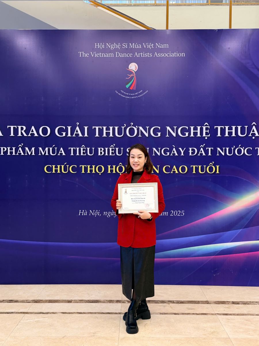 Trong số các các giải thưởng năm 2025 của Hội Nghệ sĩ Múa Việt Nam, trường Đại học Hạ Long được vinh dự xướng tên ở hạng mục Phần thưởng loại A với Chương trình thi tốt nghiệp môn Múa cổ điển châu Âu (lớp TC Múa K12) của GV Đoàn Thanh Thuỷ (bộ môn Múa, Khoa Nghệ thuật).