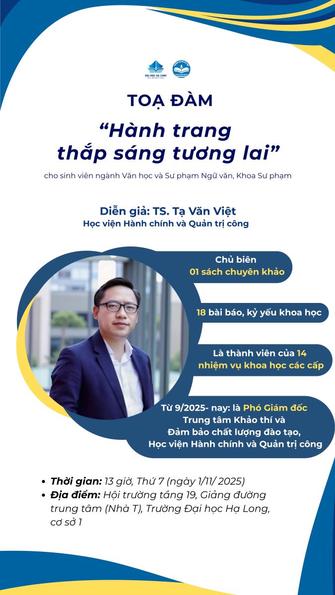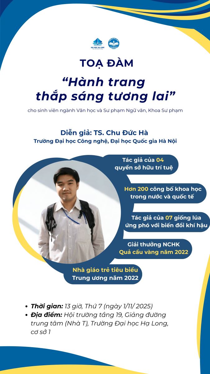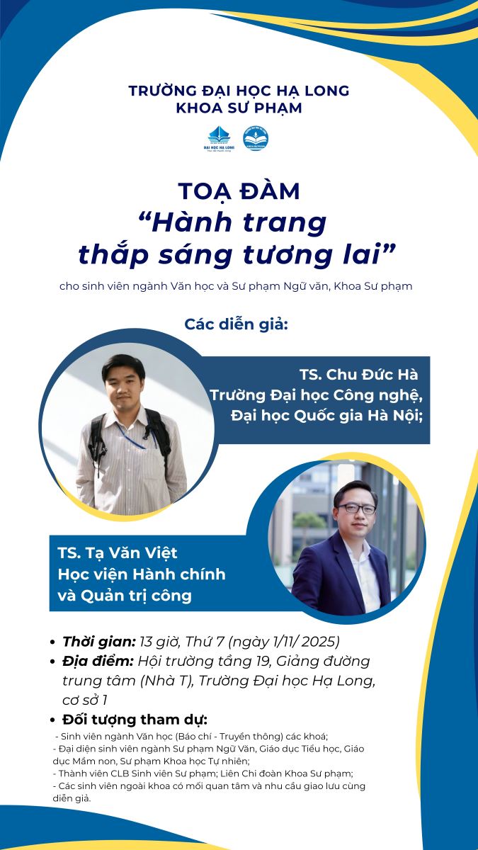 Ngày mai 31/10, tại hội trường tầng 19 (Cơ sở 1, trường Đại học Hạ Long) sẽ diễn ra buổi giao lưu toạ đàm nhằm cung cấp cho sinh viên kinh nghiệm thực tiễn và cái nhìn sâu sắc về hành trang nghề nghiệp trong tương lai giữa hai diễn giả TS. Chu Đức Hà (trường Đại học Công Nghệ, ĐHQGHN) và TS. Tạ Văn Việt (Học viện Hành chính và Quản trị công) với sinh viên khoa Sư phạm, trường Đại học Hạ Long.