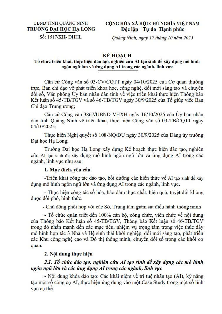 KẾ HOẠCH Tổ chức triển khai, thực hiện đào tạo, nghiên cứu AI tạo sinh để xây dụng mô hình ngôn ngữ lớn và ứng dụng AI trong các ngành, lĩnh vực