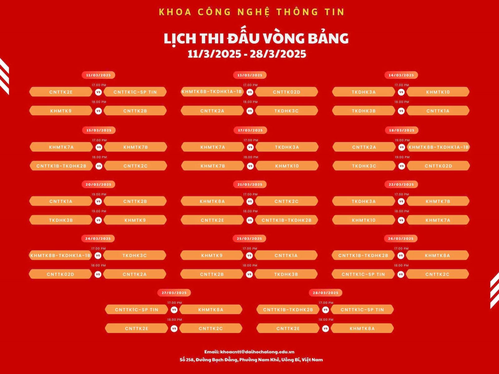 Lịch thi đấu vòng bảng sẽ diễn ra từ ngày 11/3 đến 28/3/2025, mở màn cho một mùa giải rực lửa với những trận cầu hấp dẫn. Các đội bóng sẽ thi đấu hết mình vì màu cờ sắc áo, cống hiến những pha bóng đẹp và tinh thần fair-play đúng nghĩa. Mỗi trận đấu là một màn so tài gay cấn, nơi chiến thuật, kỹ thuật và tinh thần đồng đội được thể hiện rõ nét nhất.
