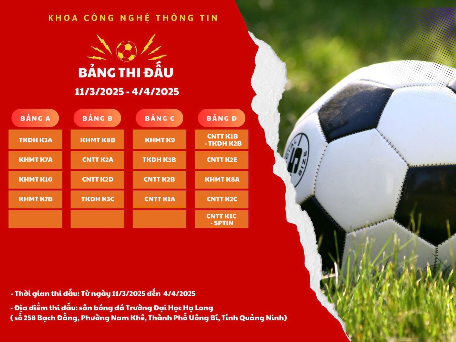 Giải bóng đá của Khoa Công Nghệ Thông Tin – Trường Đại học Hạ Long đã chính thức khởi động vào ngày 11/3/2025, đánh dấu sự trở lại đầy sôi động của sân chơi thể thao được mong đợi nhất trong năm. Đây không chỉ là dịp để các sinh viên thể hiện niềm đam mê bóng đá mà còn là cơ hội gắn kết tinh thần đồng đội, rèn luyện sức khỏe và khơi dậy tinh thần thể thao cao thượng.