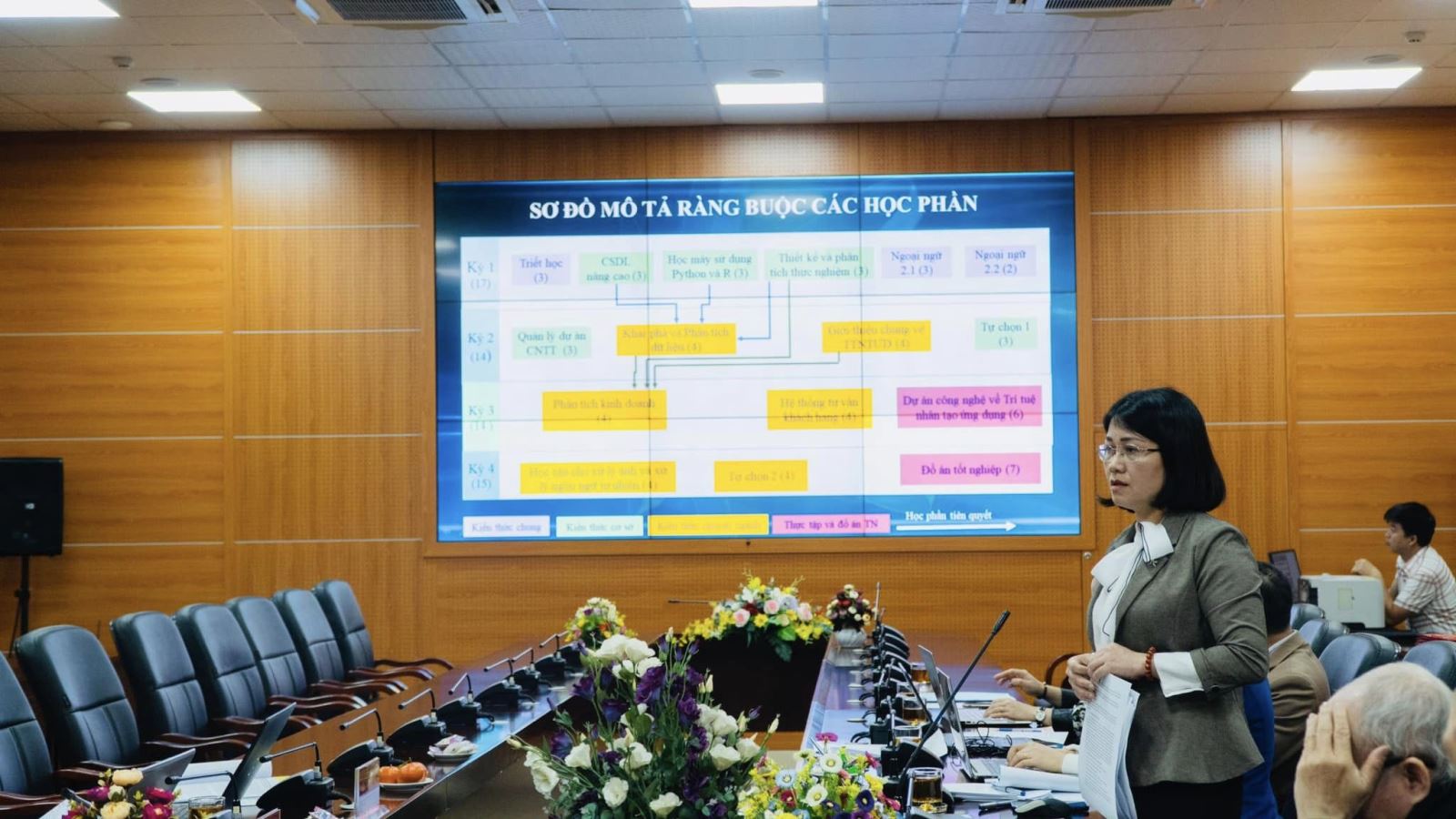 Tại buổi thẩm định, TS. Phạm Thanh Huyền, Phó trưởng Khoa Công nghệ thông tin thay mặt Tổ xây dựng chương trình đào tạo trình bày báo cáo tóm tắt nội dung chương trình đào tạo.