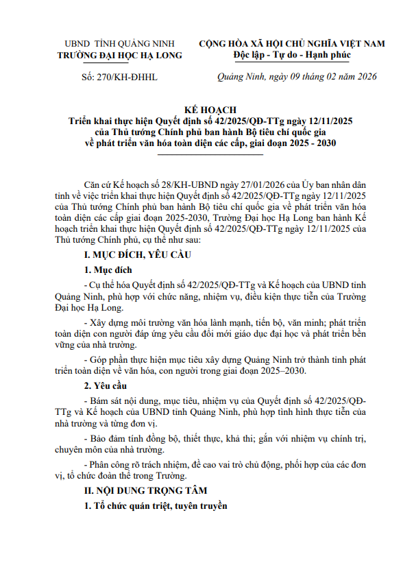 Kế hoạch Triển khai thực hiện Quyết định số 42/2025/QĐ-TTg ngày 12/11/2025 của Thủ tướng Chính phủ ban hành Bộ tiêu chí quốc gia về phát triển văn hóa toàn diện các cấp, giai đoạn 2025 - 2030
