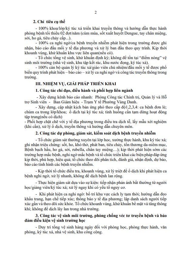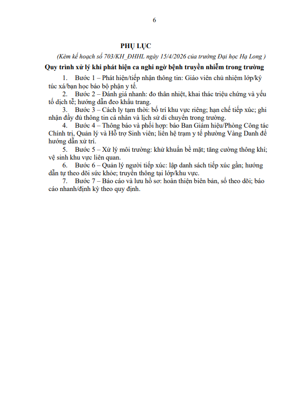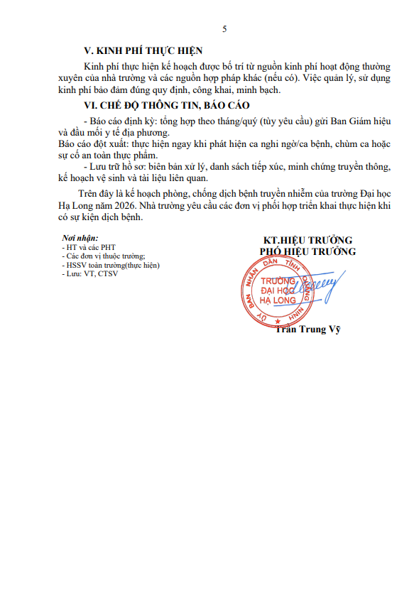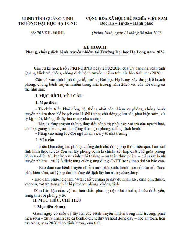 Kế hoạch phòng, chống dịch bệnh truyền nhiễm tại Trường Đại học Hạ Long năm 2026
