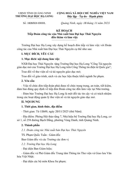 Kế hoạch tiếp Đoàn công tác của Nhà xuất bản Đại học Thái Nguyên đến thăm và làm việc