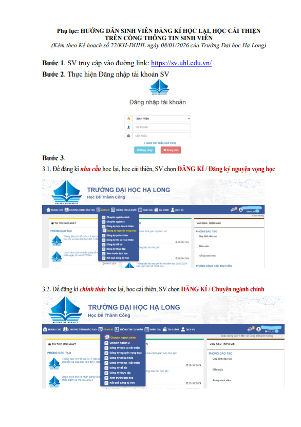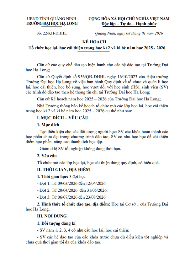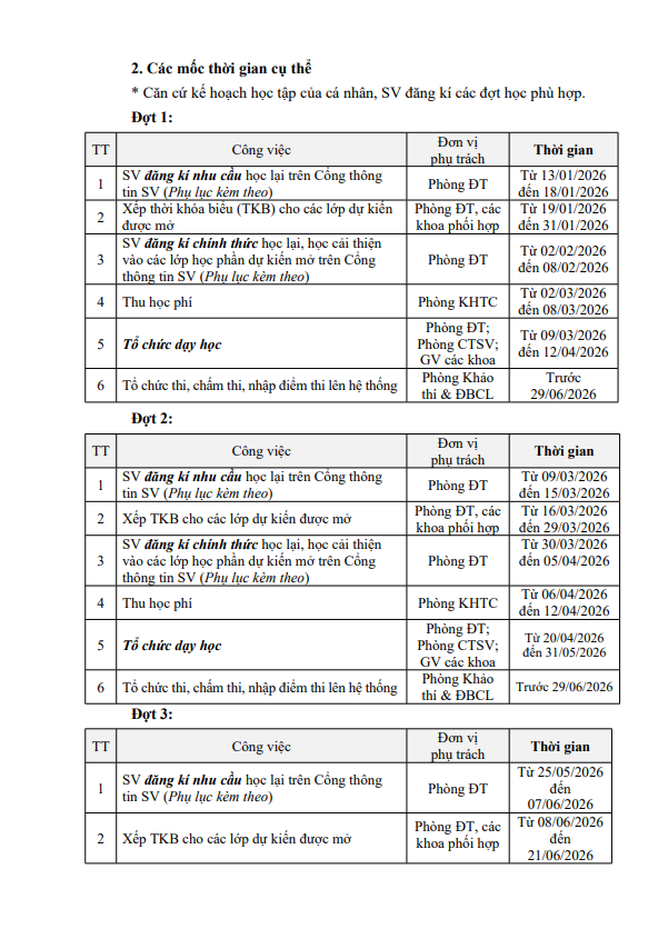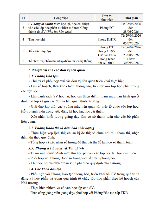 Kế hoạch tổ chức học lại, học cải thiện trong học kì 2 và kì hè năm học 2025 - 2026