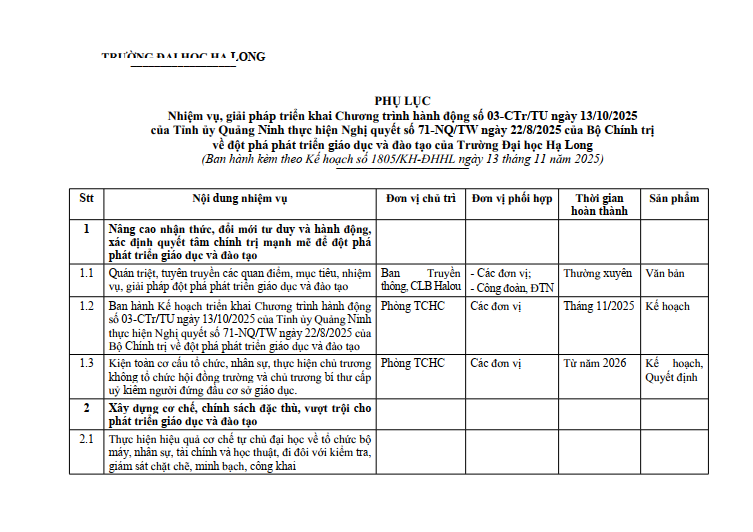 Kế hoạch triển khai Chương trình hành động số 03-CTr/TU ngày 13/10/2025 của Tỉnh ủy Quảng Ninh thực hiện Nghị quyết số 71-NQ/TW ngày 22/8/2025 của Bộ Chính trị về đột phá phát triển giáo dục và đào tạo