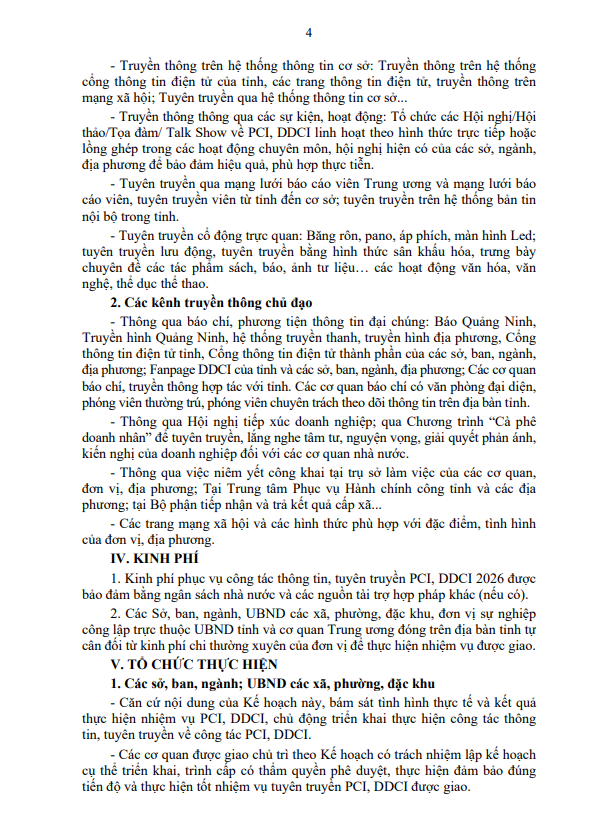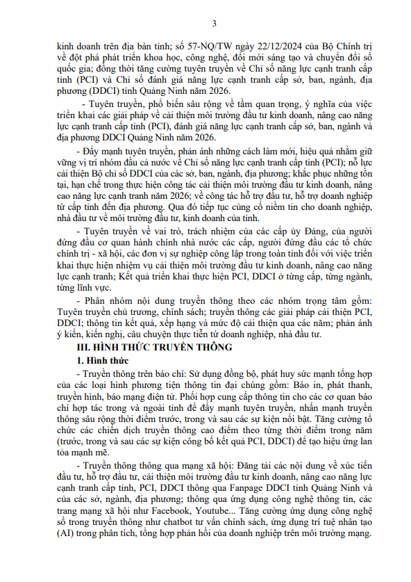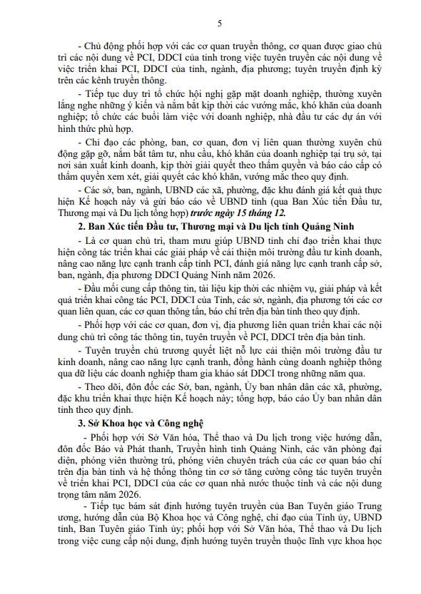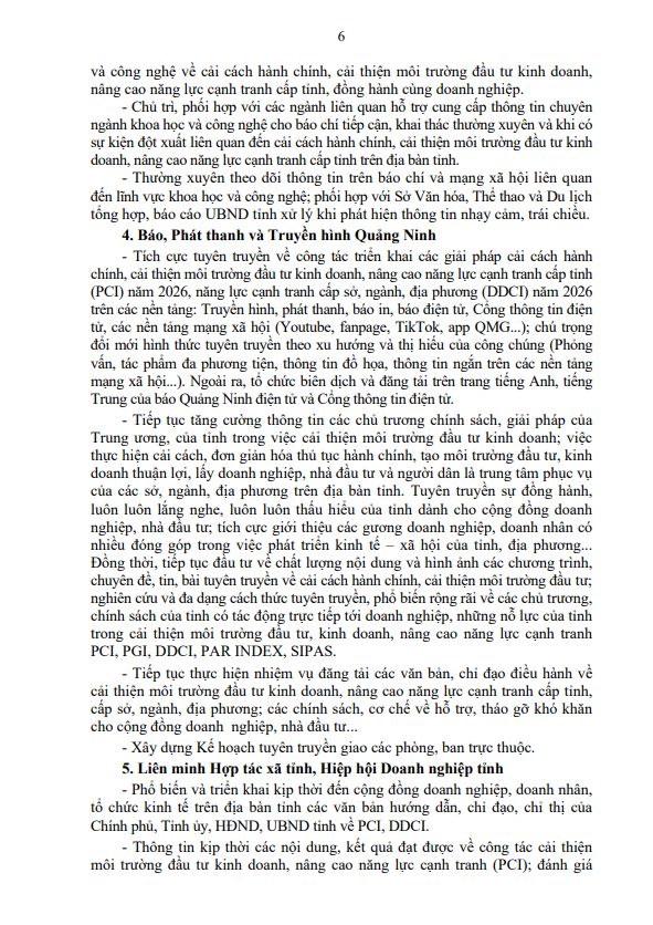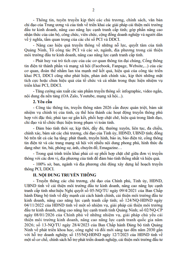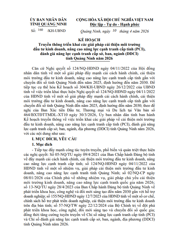 Kế hoạch truyền thông triển khai các giải pháp cải thiện môi trường đầu tư kinh doanh, nâng cao năng lực cạnh tranh cấp tỉnh (PCI), đánh giá năng lực cạnh tranh cấp sở, ban, ngành (DDCI) tỉnh Quảng Ninh năm 2026