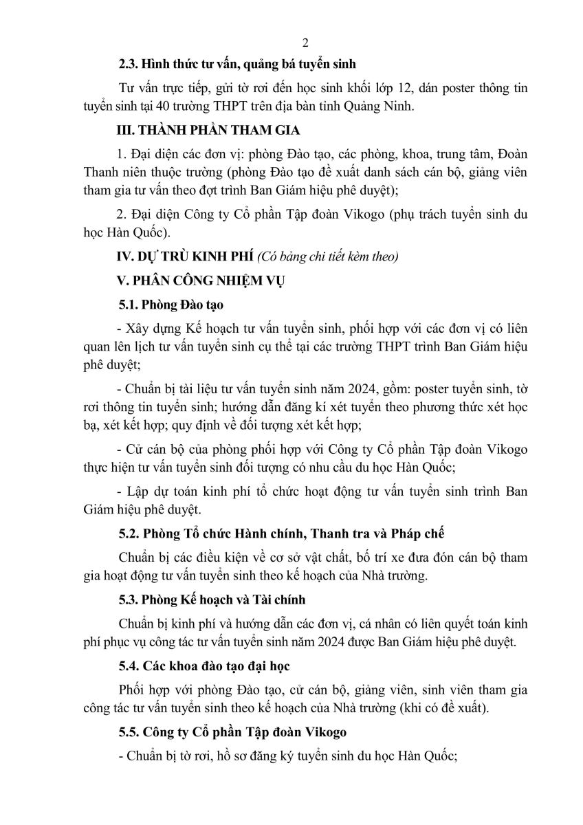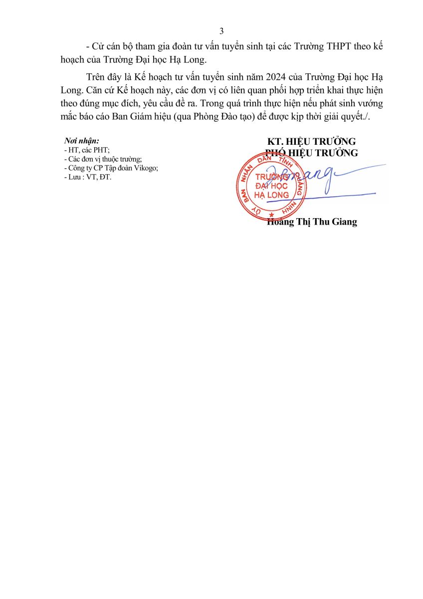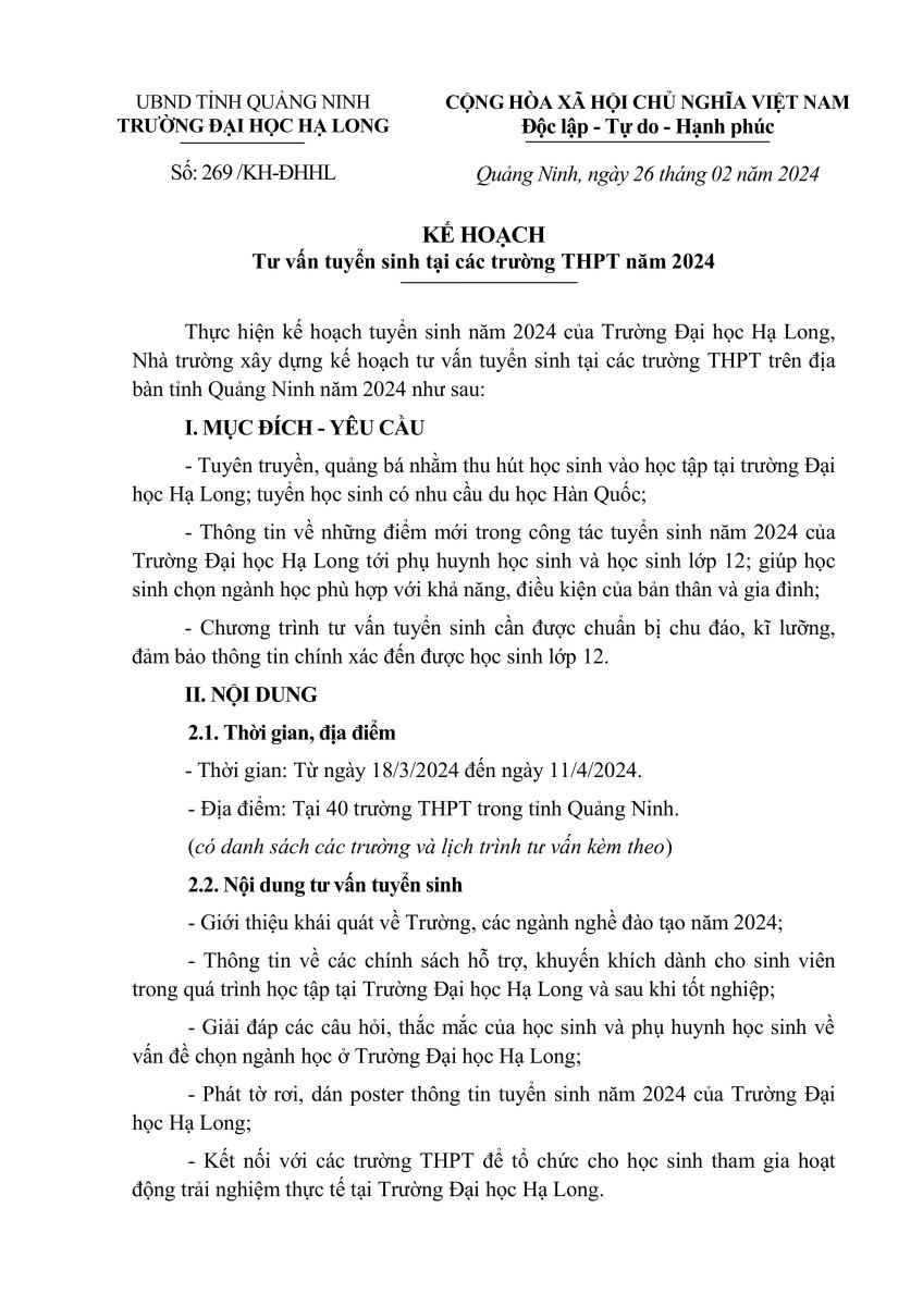 Kế hoạch tư vấn tuyển sinh tại các trường THPT năm 2024 số 269/KH- ĐHHL