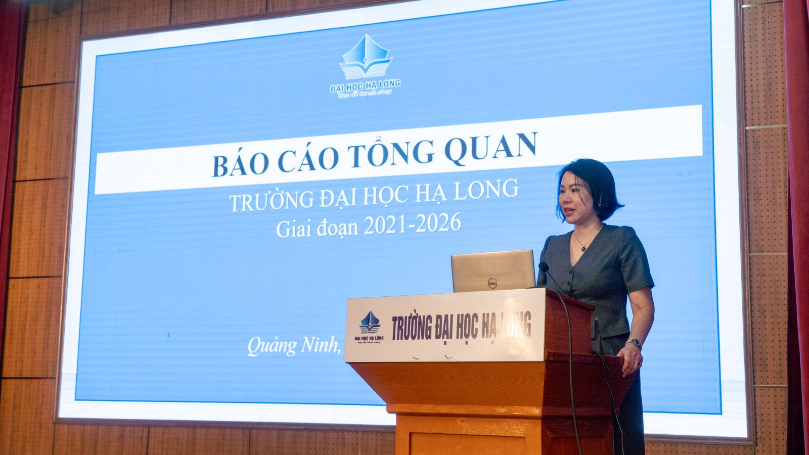 Kết thúc Lễ khai mạc, PGS.TS. Hoàng Thị Thu Giang – Phó Hiệu trưởng Nhà trường đại diện Lãnh đạo Nhà trường đã trình bày trước Đoàn Khảo sát về sứ mệnh tầm nhìn, các giá trị cốt lõi, cũng như những đặc điểm, thành tựu nổi bật của Trường Đại học Hạ Long. Bên cạnh đó, PGS.TS. Hoàng Thị Thu Giang đã chia sẻ nhiều thông tin về quá trình tự đánh giá trong thời gian qua, thể hiện tinh thần hợp tác và quyết tâm của Nhà trường trong các hoạt động khảo sát chính thức với Đoàn Chuyên gia Đánh giá ngoài sắp tới.