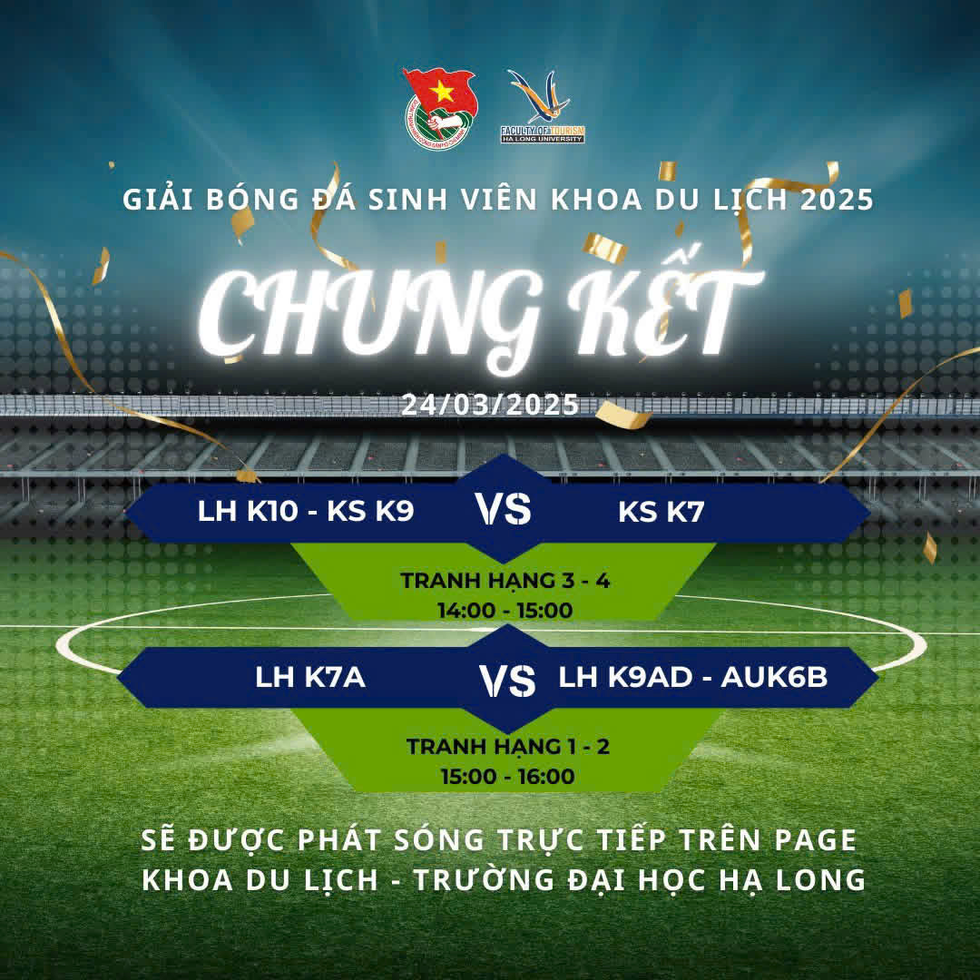 Thời gian tổ chức vào ngày 24/3/2025 tại sân bóng số 1, Trường Đại học Hạ Long. Trận đấu tranh hạng ba sẽ diễn ra vào lúc 14h00 giữa đội LHK10 - KS K9 và đội KS K7. Ngay sau đó, vào lúc 15h00 sẽ là trận chung kết giữa đội LH K7A và đội LHK9AD AUK6B. Đây là những đội bóng đã thể hiện phong độ ấn tượng xuyên suốt mùa giải và xứng đáng góp mặt ở vòng đấu quan trọng nhất.