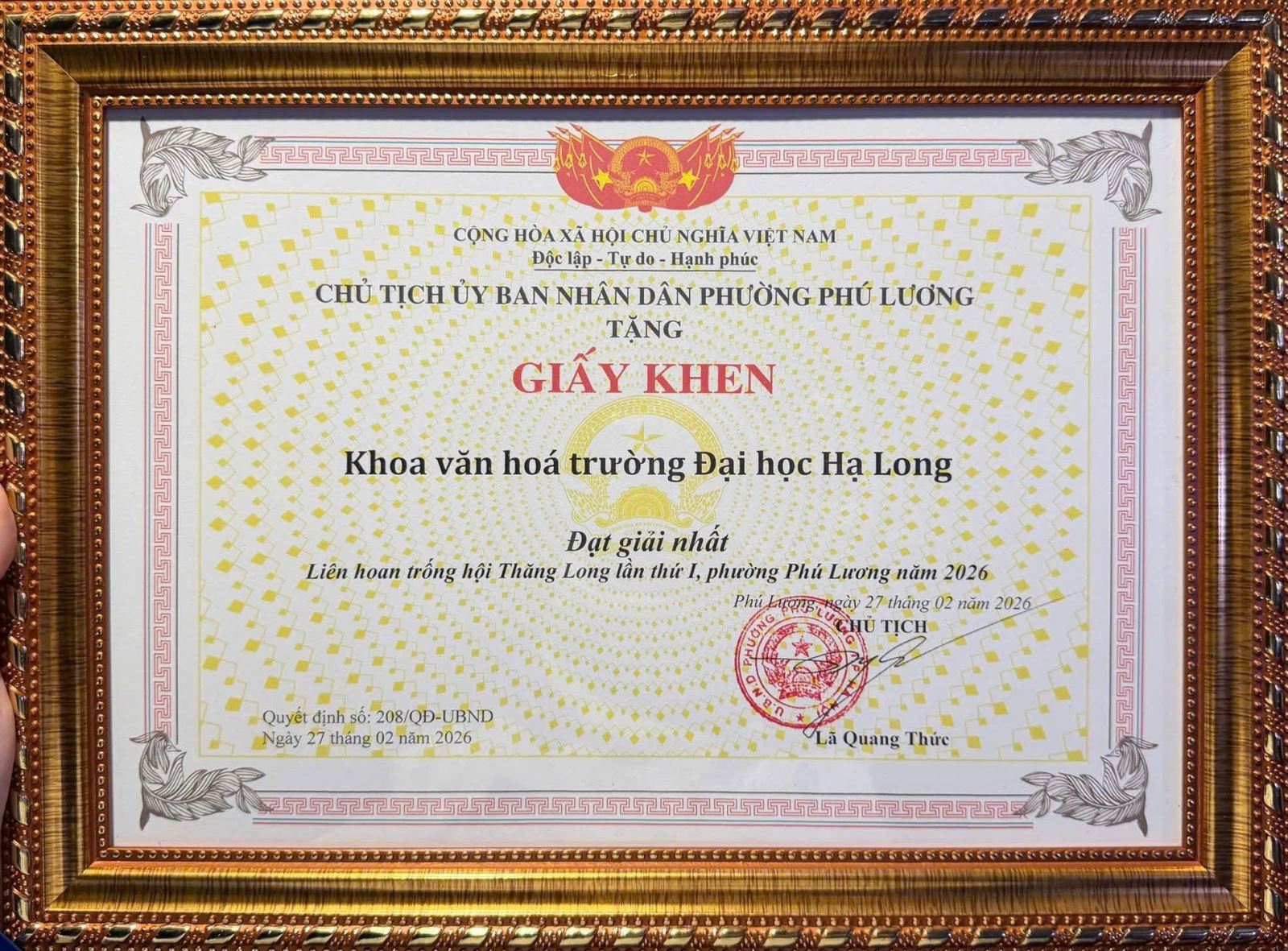 Khoa Văn hoá vinh dự đạt giải Nhất tại Liên hoan Trống hội Thăng Long lần thứ nhất năm 2026 với chủ đề “Ngày hội non sông” do phường Phú Lương, Thủ đô Hà Nội tổ chức tại đình Văn Nội vào tối ngày 27 tháng 02 năm 2026 (tức ngày 11 tháng Giêng năm Bính Ngọ).
