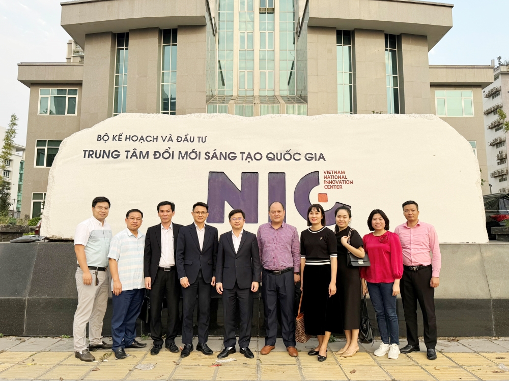 Đoàn công tác của Trường Đại học Hạ Long chụp ảnh lưu niệm tại Trung tâm Đổi mới sáng tạo Quốc gia
