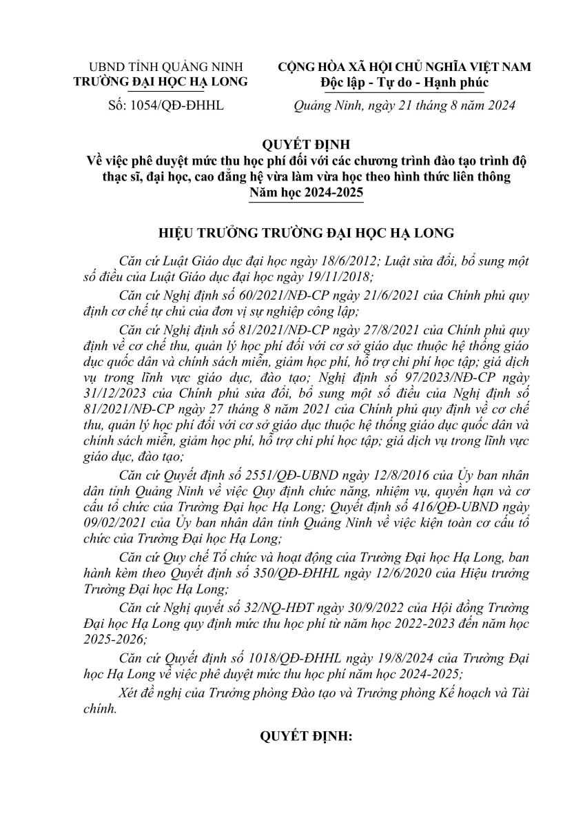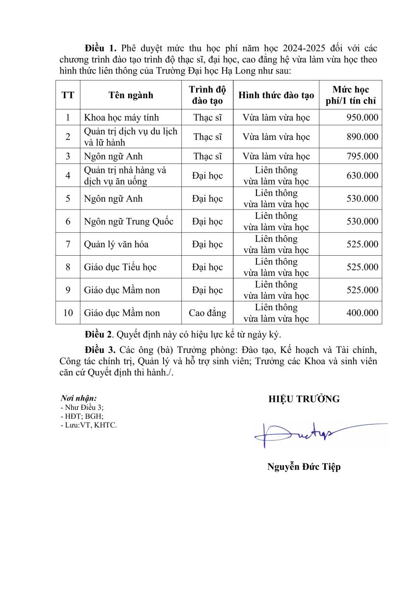 Mức học phí đối với các chương trinh đào tạo trình độ thạc sĩ, đại học, cao đẳng hệ vừa làm vừa học theo hình thức liên thông năm học 2024-2025
