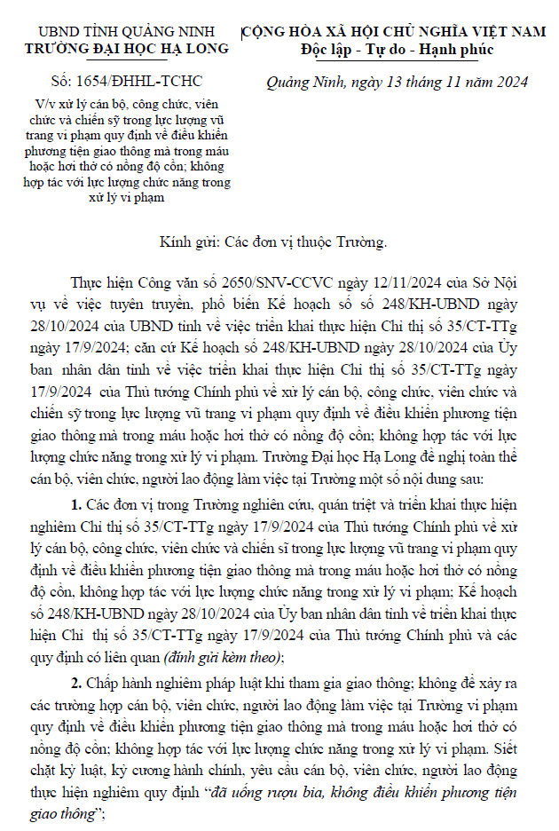 V/v xử lý cán bộ, công chức, viên chức và chiến sỹ trong lực lượng vũ trang vi phạm quy định về điều khiển phương tiện giao thông mà trong máu hoặc hơi thở có nồng độ cồn; không hợp tác với lực lượng chức năng trong xử lý vi phạm