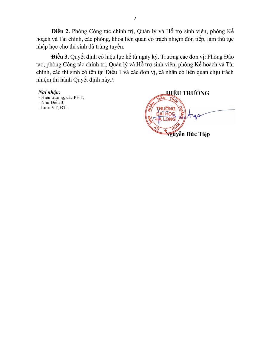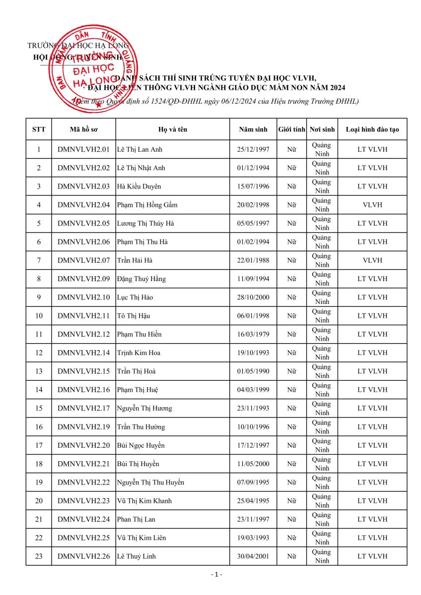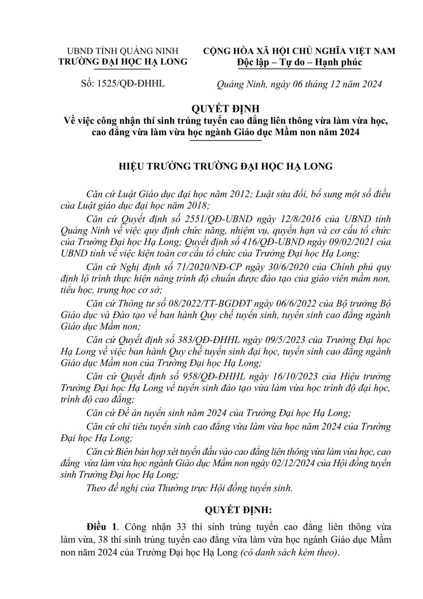 QUYẾT ĐỊNH Về việc công nhận thí sinh trúng tuyển cao đẳng, đại học liên thông vừa làm vừa học, đại học vừa làm vừa học ngành Giáo dục Mầm non năm 2024
