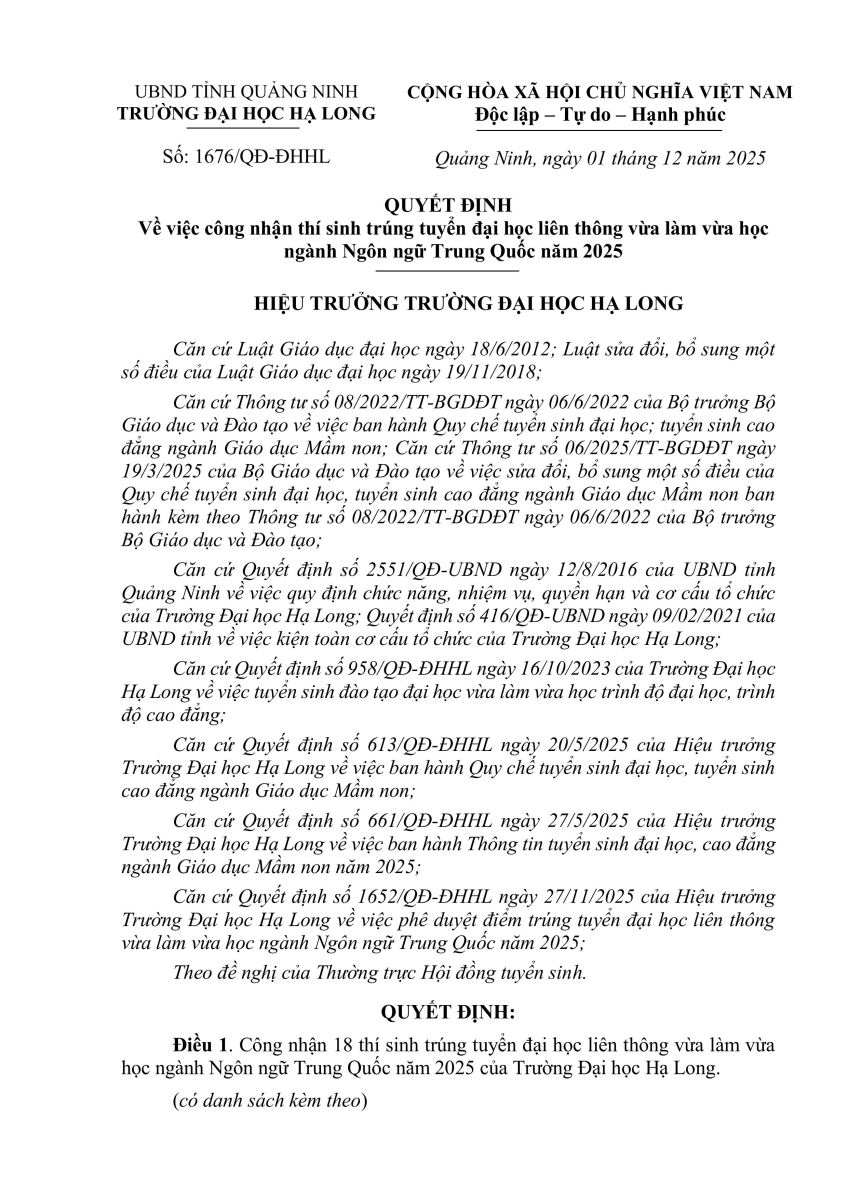 QUYẾT ĐỊNH Về việc công nhận thí sinh trúng tuyển đại học liên thông vừa làm vừa học ngành Ngôn ngữ Trung Quốc năm 2025