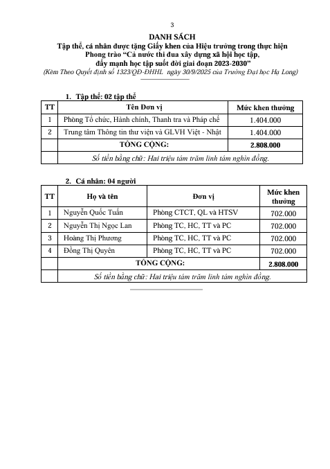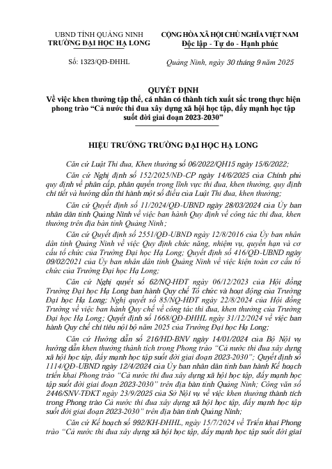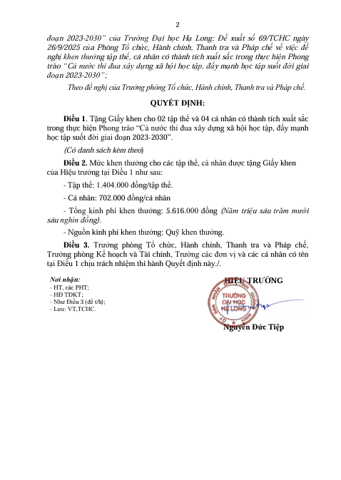 Quyết định về việc khen thưởng tập thể, cá nhân có thành tích xuất sắc trong thực hiện phong trào “Cả nước thi đua xây dựng xã hội học tập, đẩy mạnh học tập suốt đời giai đoạn 2023-2030”