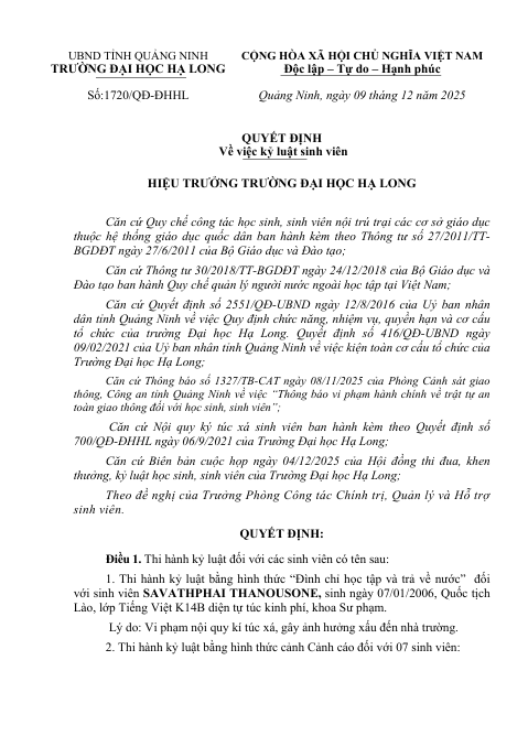 Quyết định về việc kỷ luật sinh viên Lào vi phạm nội quy, quy chế học sinh, sinh viên