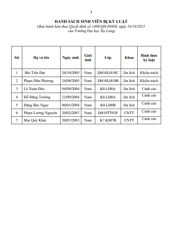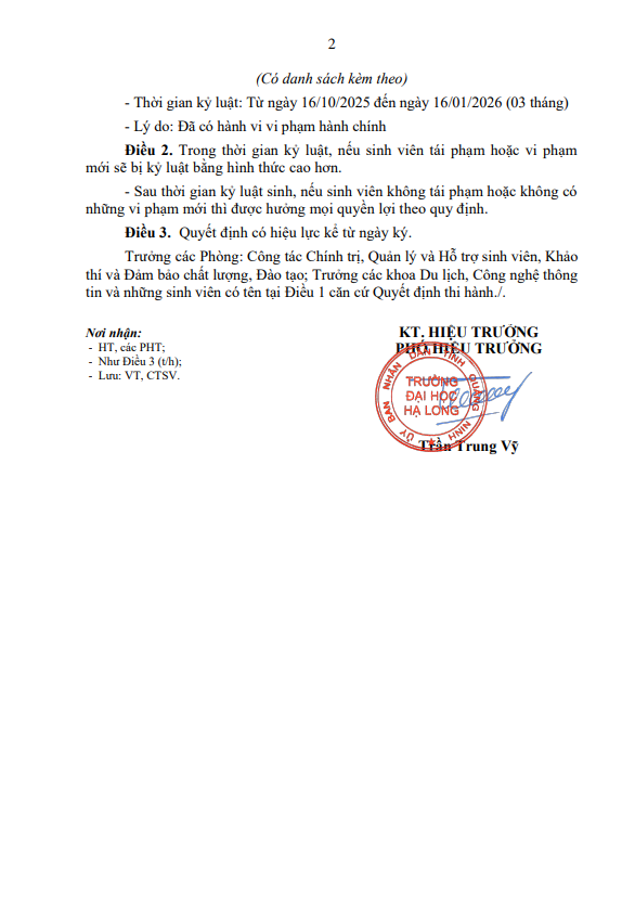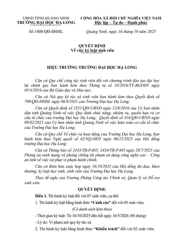 Quyết định về việc kỷ luật sinh viên vi phạm nội quy ký túc xá