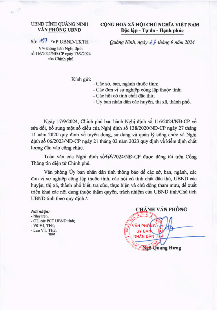 Công văn Thông báo Nghị định số 116/2024/NĐ-CP ngày 17/9/2024 của Chính phủ về việc Sửa đổi bổ sung một số điều của Nghị định số 138/2020/NĐ-CP ngày 27/11/2020