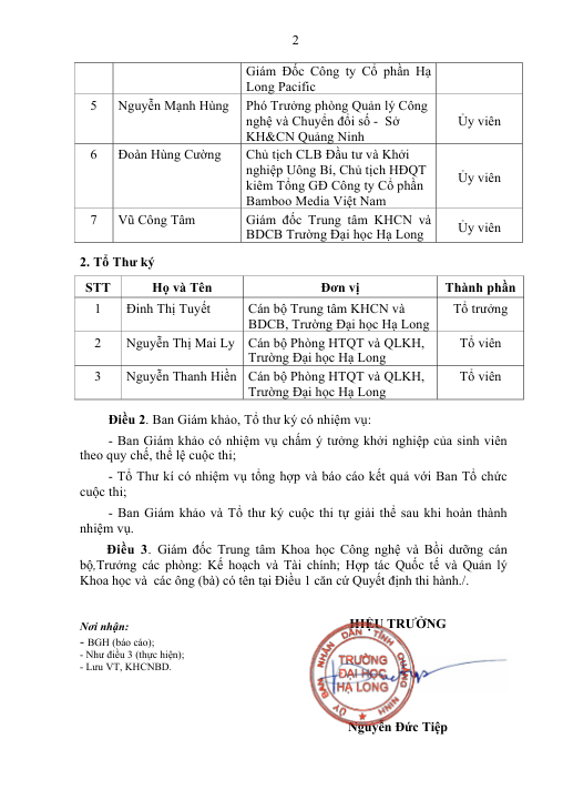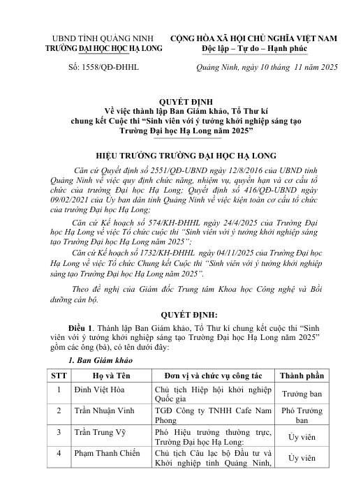 Quyết định về việc thành lập Ban Giám khảo, Tổ Thư kí chung kết Cuộc thi “Sinh viên với ý tưởng khởi nghiệp sáng tạo Trường Đại học Hạ Long năm 2025