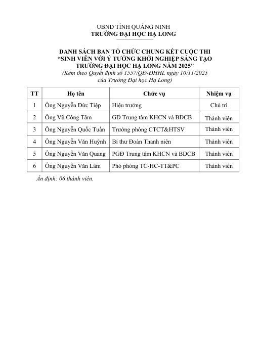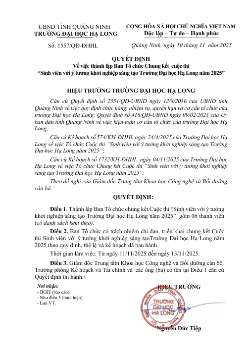 Quyết định về việc thành lập Ban Tổ chức Chung kết cuộc thi “Sinh viên với ý tưởng khởi nghiệp sáng tạo Trường Đại học Hạ Long năm 2025”