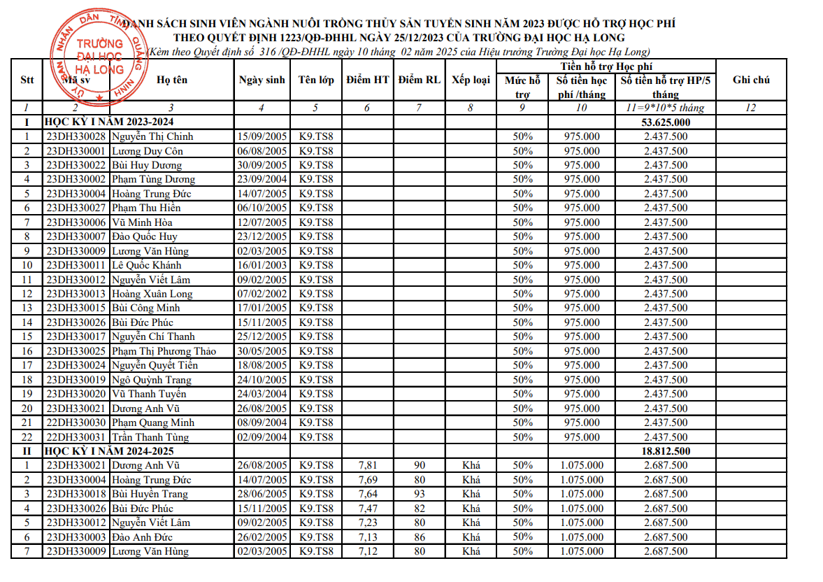 Quyết định về việc thực hiện chế độ hỗ trợ học phí đối với sinh viên ngành Nuôi trồng thủy sản tuyển sinh năm 2023