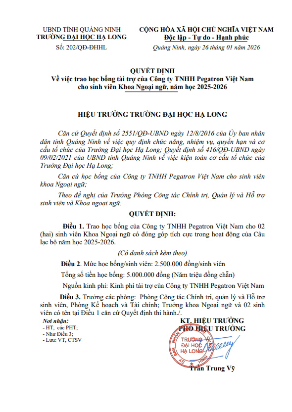Quyết định về việc trao học bổng tài trợ của Công ty TNHH Pegatron Việt Nam cho sinh viên Khoa Ngoại ngữ, năm học 2025-2026