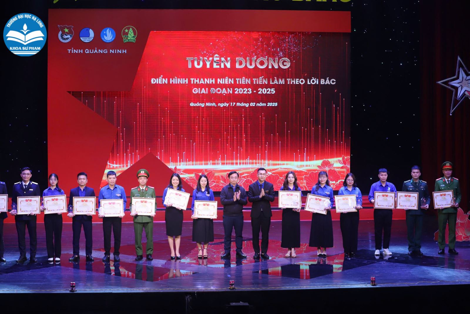 Khoa Sư phạm, Trường Đại học Hạ Long vinh dự khi có 02 sinh viên được nhận Bằng khen “Thanh niên tiên tiến làm theo lời Bác giai đoạn 2023 - 2025” của Ban Chấp hành Đoàn TNCS Hồ Chí Minh tỉnh Quảng Ninh, gồm: Em Lâm Thị Trường, Ủy viên Ban Chấp hành Hội sinh viên tỉnh, Phó Chủ nhiệm Câu lạc bộ Sinh viên 5 Tốt trường Đại học Hạ Long; Em Đào Hà Trang, Phó Bí thư Liên chi đoàn khoa Sư phạm, Bí thư Chi đoàn K7.SMN1 trường Đại học Hạ Long.