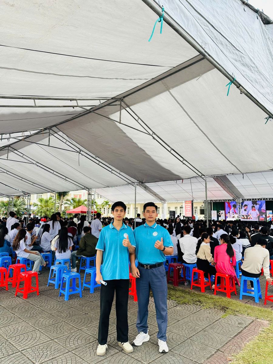 Tham gia hoạt động có hai sinh viên của Khoa trong trang phục áo xanh đặc trưng của ngành Thủy sản, mang đến hình ảnh trẻ trung, năng động và thân thiện. Các bạn đã trực tiếp gặp gỡ, trao đổi và tư vấn cho học sinh về các ngành đào tạo của Khoa, đặc biệt là ngành Nuôi trồng thủy sản (NTTS) — lĩnh vực có tiềm năng phát triển mạnh mẽ, phù hợp với định hướng kinh tế biển của tỉnh Quảng Ninh.