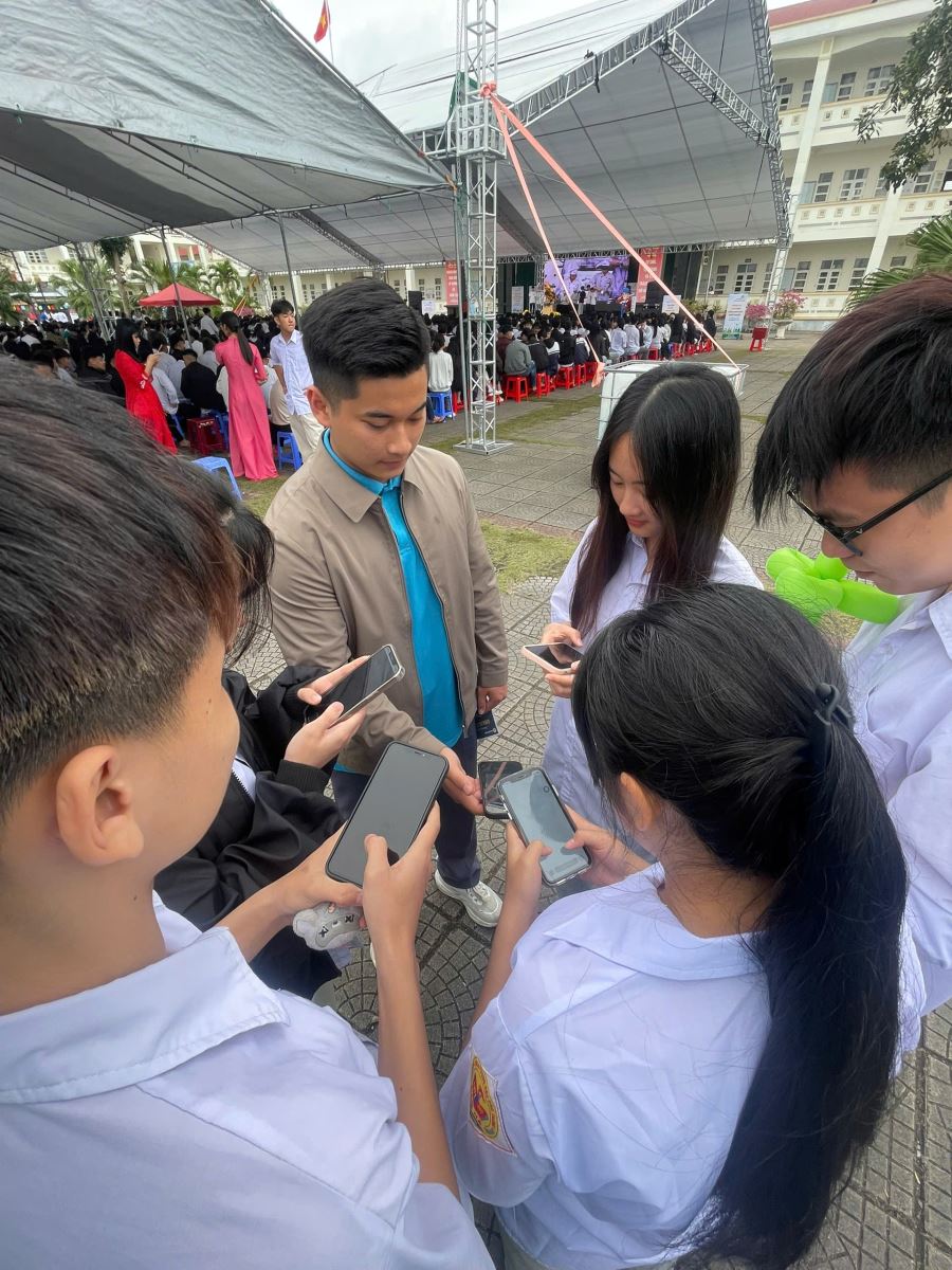 Các em học sinh trường THPT Đầm Hà tham gia quét mã QR vào nhóm Zalo tư vấn ngành NTTS