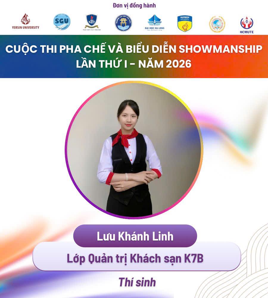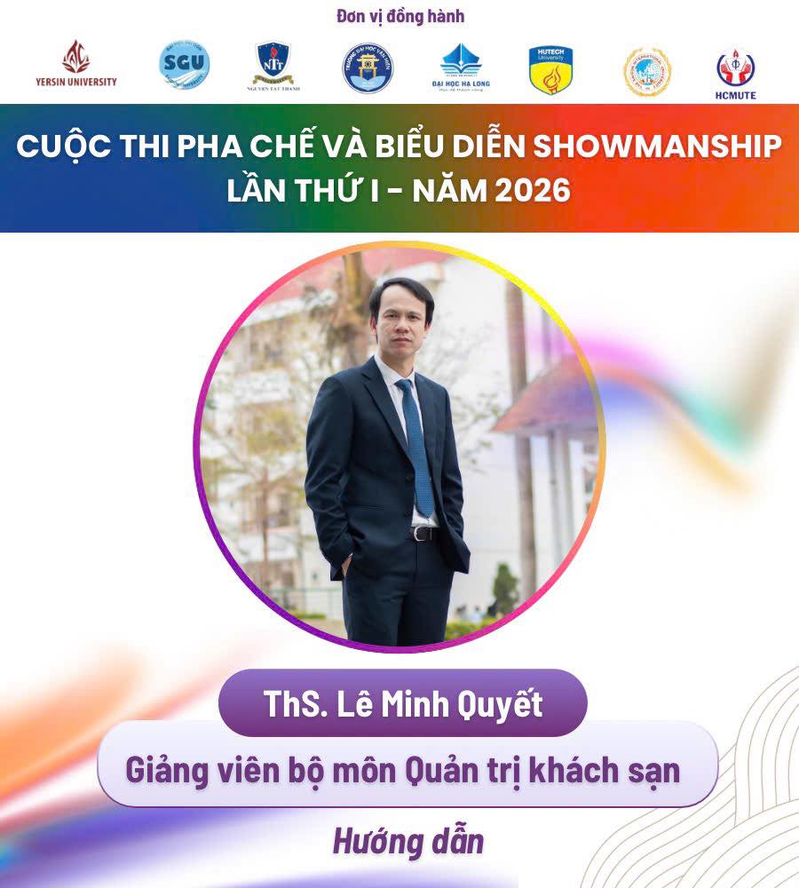 Khoa Du lịch – Trường Đại học Hạ Long tự hào giới thiệu sinh viên và giảng viên hướng dẫn chính thức tham gia Vòng Bán kết Cuộc thi “Pha chế và Biểu diễn Showmanship lần thứ I – năm 2026” do Trường Đại học Công Thương Thành phố Hồ Chí Minh tổ chức. Đây là sân chơi chuyên môn uy tín, quy tụ nhiều cơ sở đào tạo và thí sinh tài năng trong lĩnh vực pha chế trên phạm vi toàn quốc.