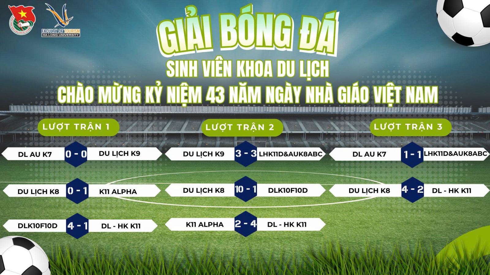 Giải bóng đá nam sinh viên Khoa Du lịch chào mừng ngày Nhà giáo Việt Nam 20/11 đã diễn ra thành công tốt đẹp, để lại nhiều khoảnh khắc đáng nhớ và tiếp tục khẳng định tinh thần thể thao, đoàn kết của sinh viên Khoa Du lịch. Hoạt động là động lực để sinh viên tiếp tục rèn luyện, phấn đấu và xây dựng môi trường học tập năng động, tích cực tại Trường Đại học Hạ Long.